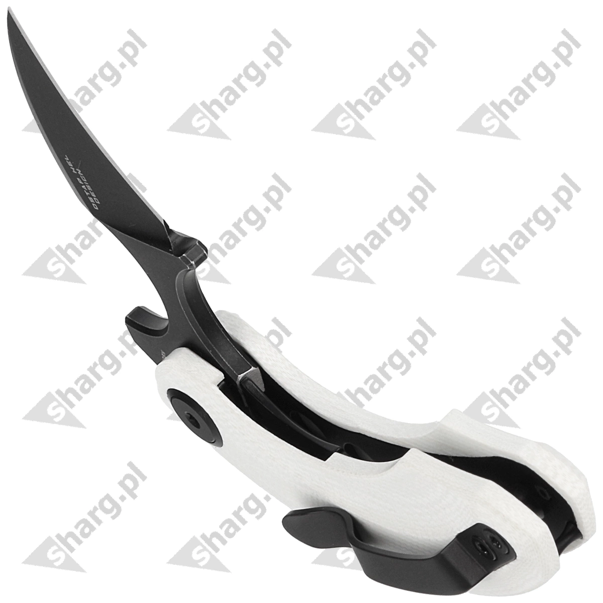 Głownia - typu Hawkbill z maskującym rysy wykończeniem Stonewashed pokrytym czarną powłoką. Wklęsła krawędź tnąca zbiega się w kierunku ostrego jak igła czubka noża. Grubość klingi zapewnia wysoką wytrzymałość podczas gdy wysoki, płaski szlif daje doskonałą geometrię krawędzi tnącej oraz ekstremalną wydajność cięcia. Ceramiczne łożyska kulkowe wspomagają otwarcie ostrza za pomocą szybkiej płetwy flippera (index-finger flipper). Całość blokowana jest sprawdzoną i popularną blokadą liner lock. Po otwarciu, przewężenie tuż za głownią pozwala wygodnie uchwycić nóż zaciśniętą ręką, w pozycji push-dagger. Ostrze wystaje wtedy spomiędzy palców niczym drapieżny szpon!