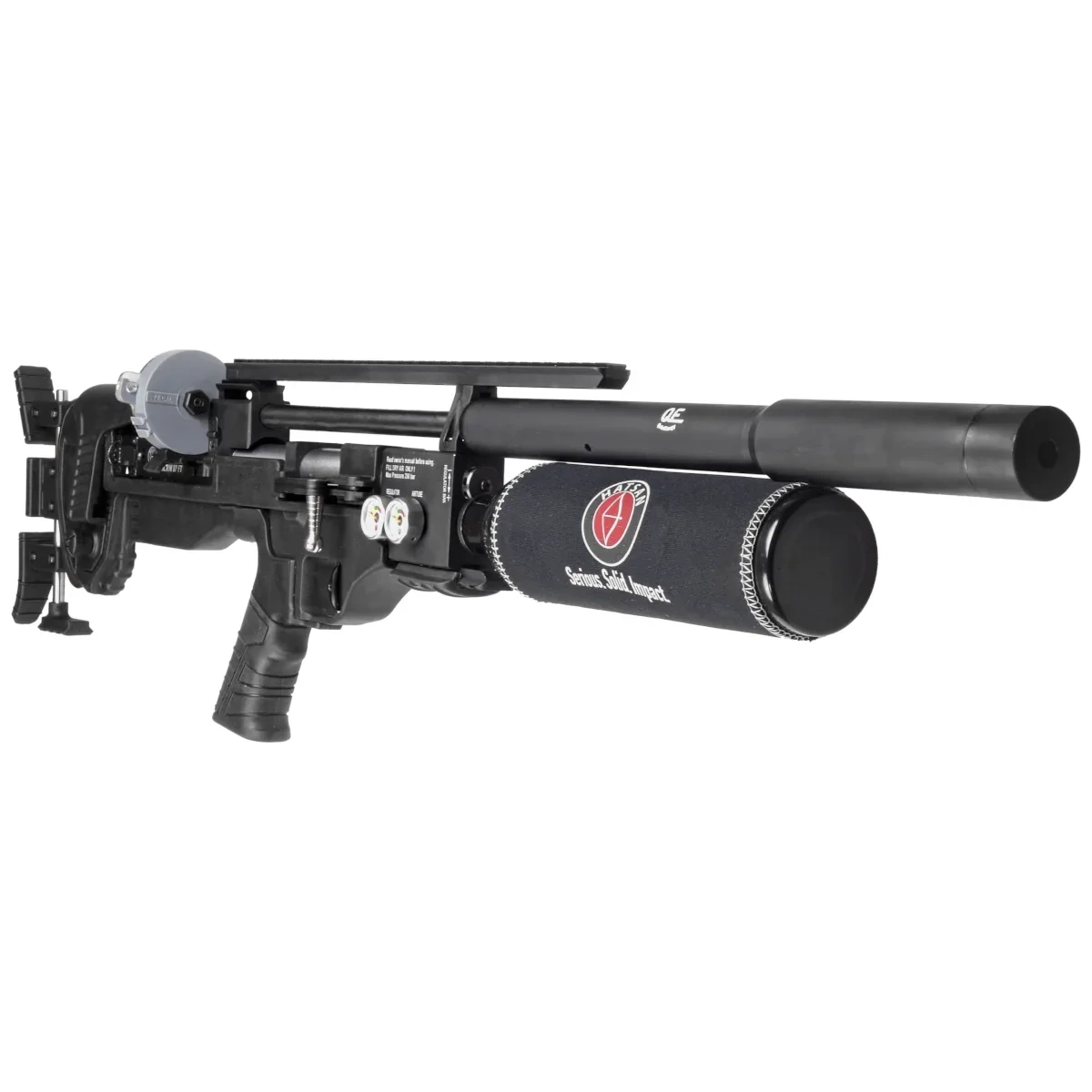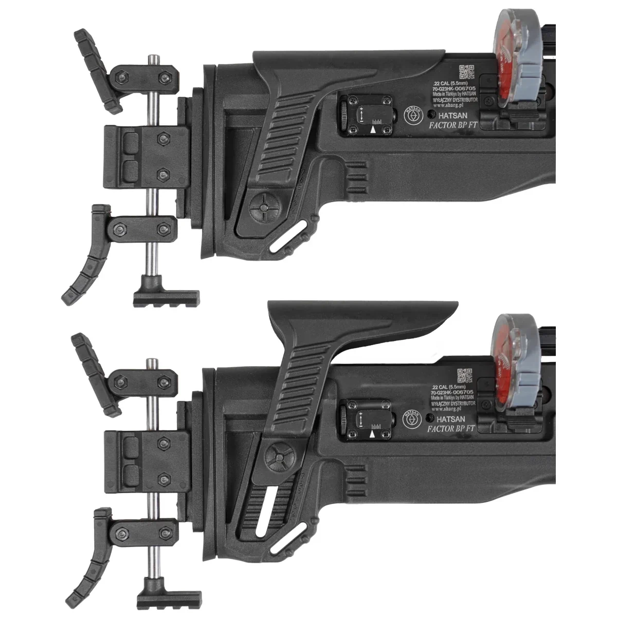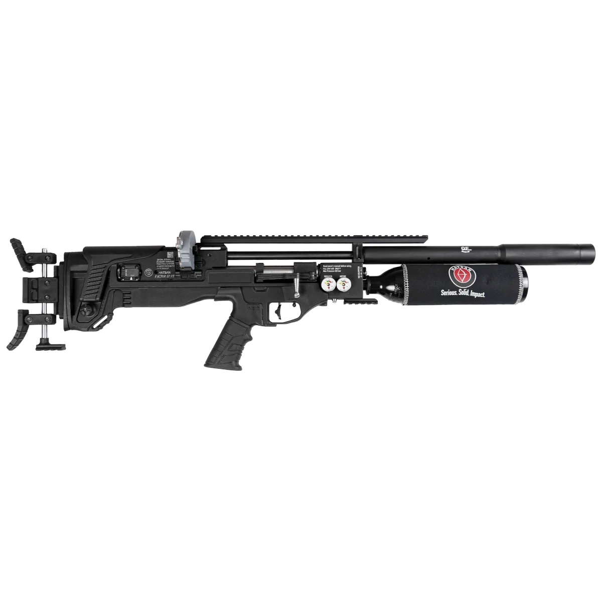 Factor FT karabin PCP od Hatsan. Wyposażony w dźwignię napinania Side Lever, regulator mocy strzału, pokrętło regulacji mechanizmu spustowego, lufę ze zintegrowanym tłumikiem dźwięku QE. Dostępny w kalibrach .177 (4.5 mm), .22 (5.5 mm), .25 (6.35 mm)