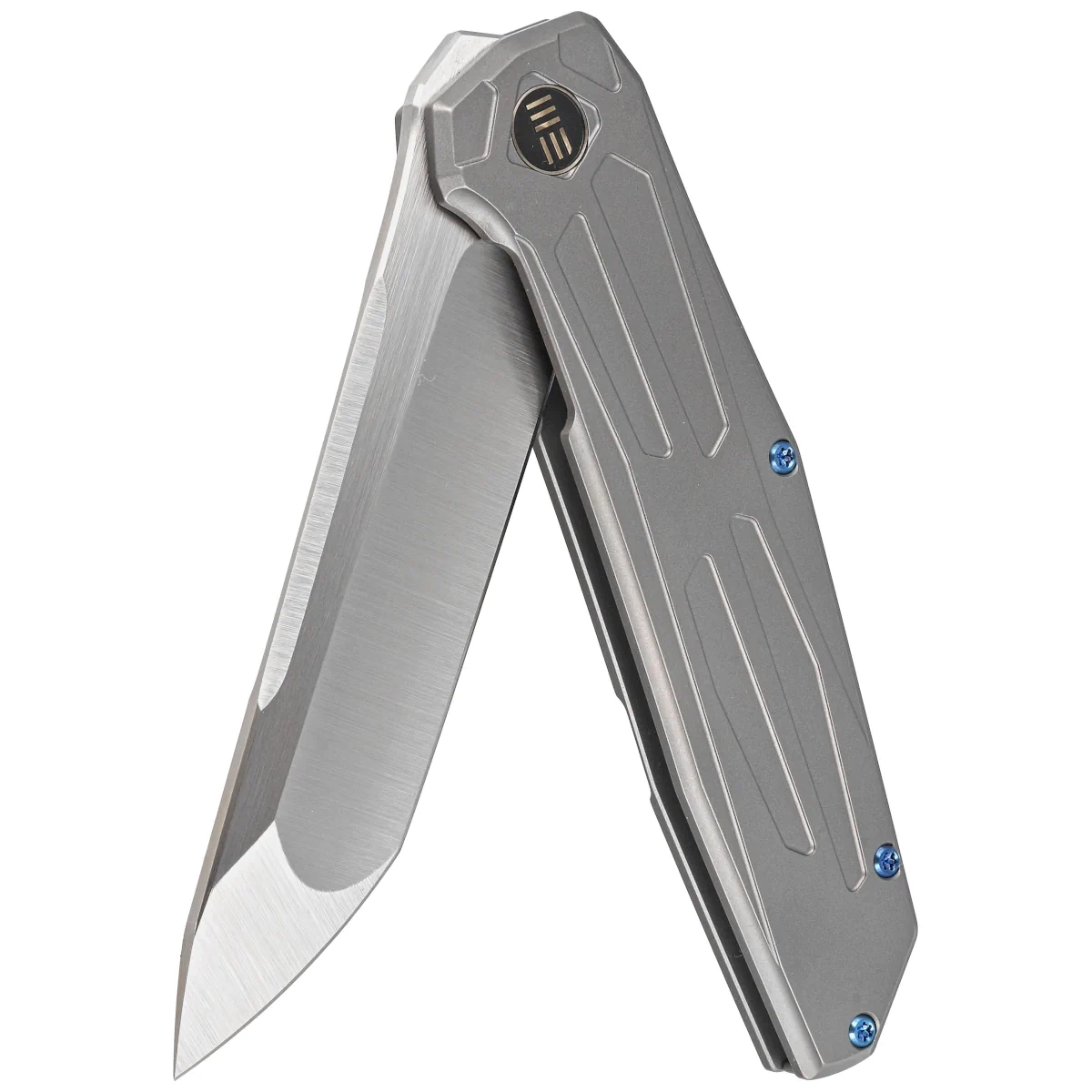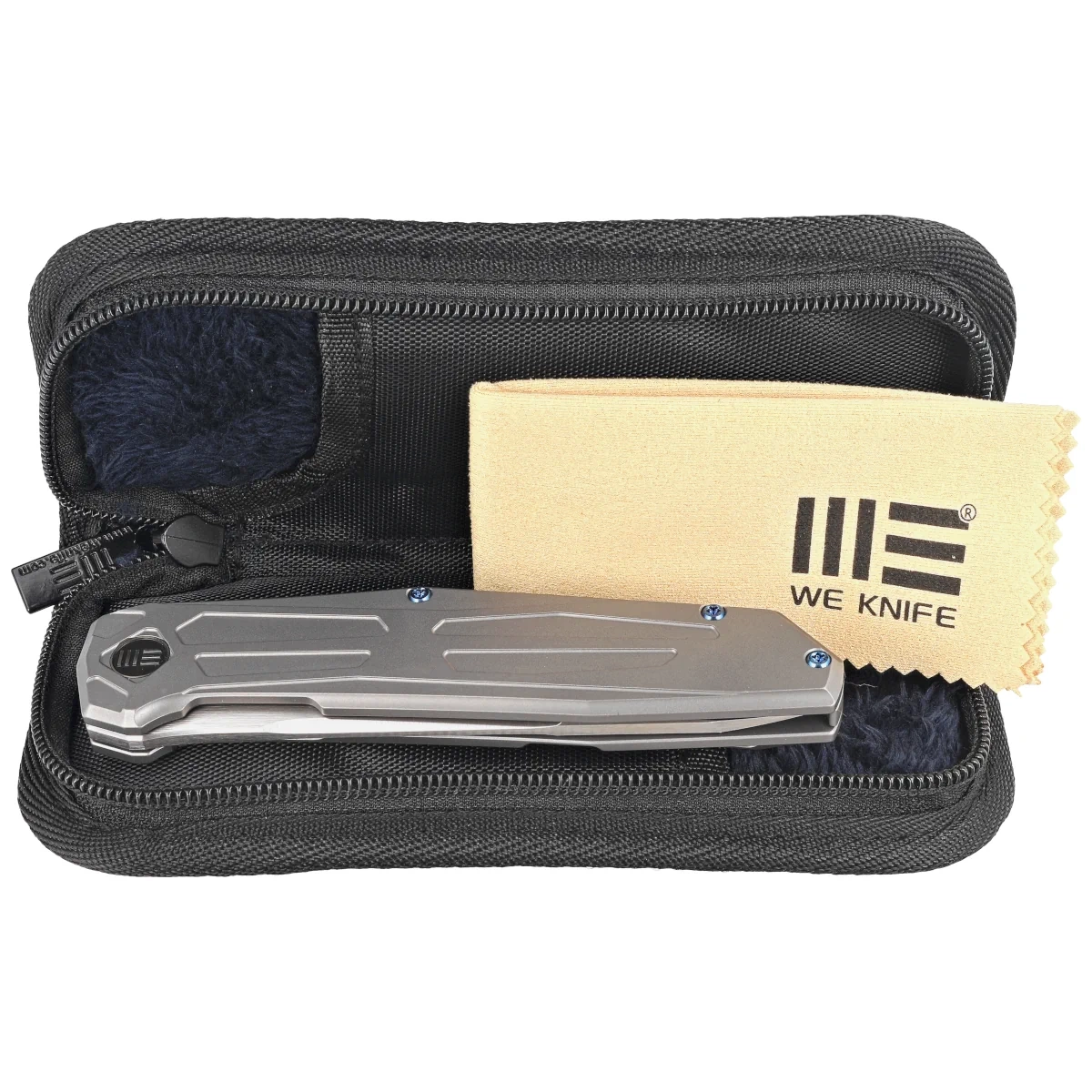 Rękojeść - z tytanu 6AL4V, fazowane krawędzie okładek eliminują ostre krawędzie. Kunsztowne frezowanie odciąża wizualnie kształt rękojeści. Okładziny przykręcono do tytanowego backspacera, dzięki temu nóż zachowuje pożądaną sztywność i wytrzymałość zapewniając bezproblemowe działanie na lata. Oś pivota zdobi stylizowane logo marki WE Knife. Jednopozycyjny (prawa) tytanowy klips deep carry pozwala przenosić dyskretnie nóż w kieszeni w pozycji tip-up (czubkiem ostrza do góry).
