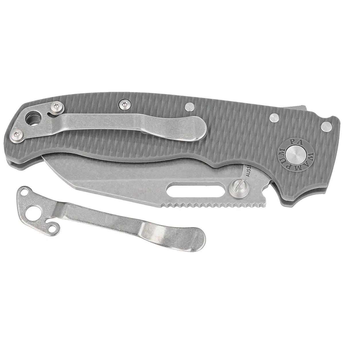 Rękojeść - okładziny z Grivory, praktycznie niezniszczalnego tworzywa niewrażliwego na warunki atmosferyczne, odpornego na chemikalia i uszkodzenia mechaniczne. Fazowane krawędzie okładek eliminują ostre ranty a charakterystyczne teksturowanie powierzchni poprawia pewność uchwytu. Jednopozycyjny, prawostronny klips umożliwia przenoszenie noża w pozycji tip-up, czubkiem ostrza ku górze. W zestawie dodawany jest klips dla leworęcznych.