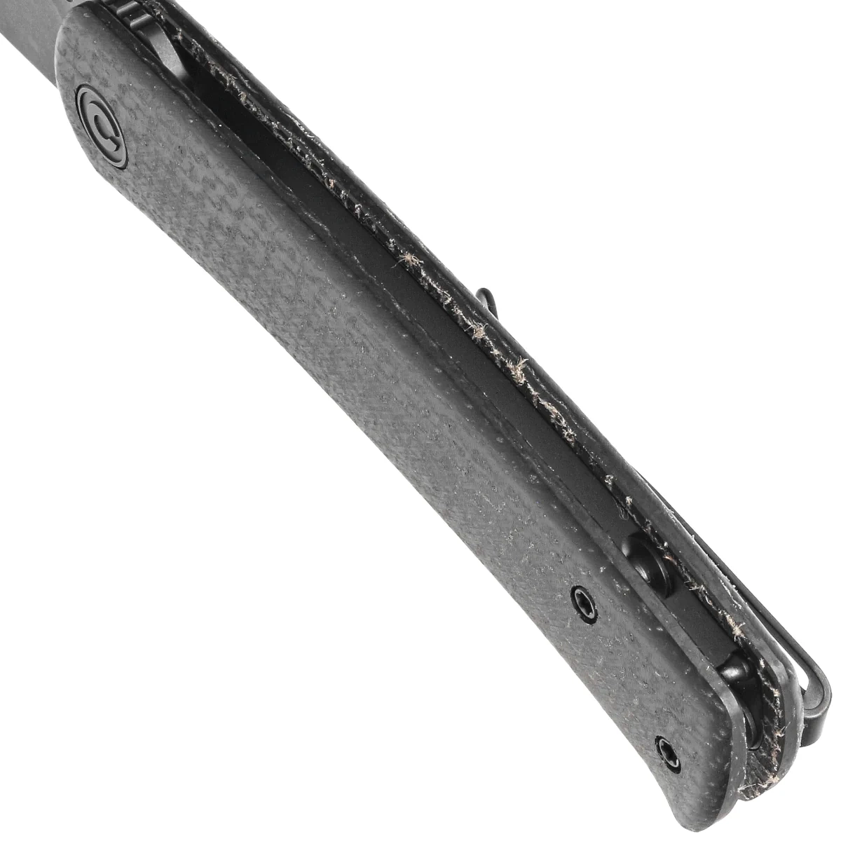 Rękojeść - okładziny z tworzywa Burlap Micarta, tkanina jutowa prasowana pod ciśnieniem z żywicą syntetyczną. Fazowane krawędzie okładek eliminują ostre krawędzie dla wygody chwytu. Otwarta konstrukcja tzw. open-backed mocowana stalowymi tulejami dystansowymi redukuję wagę oraz ułatwia czyszczenie. Oś pivota zdobi stylizowane logo marki Civivi. Jednopozycyjny, prawostronny klips deep carry pozwala przenosić dyskretnie nóż w kieszeni w pozycji tip-up (czubkiem ostrza do góry).
