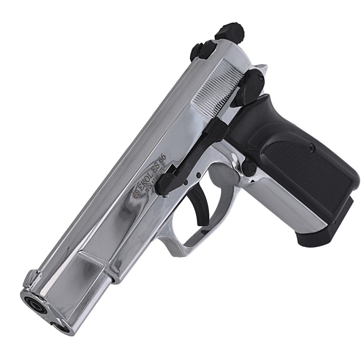 Ekol ES 66 Shiny pistolet pneumatyczny o konstrukcji opartej na broni sygnałowej firmy Voltran. Oferuje realistyczny wygląd oraz solidną konstrukcję, zapewniającą trwałość i niezawodność. Zamek (slide), korpus (frame), kurek (hammer), dźwignia decockera (decocker lever) oraz drobne elementy pistoletu zostały wykonane z metalu. Dzięki tak silnym korzeniom, ta jedna z najmocniejszych pistoletowych wiatrówek o prędkości 150 m/s nadaje się do dynamicznego strzelectwa sportowego lub treningu taktycznego.