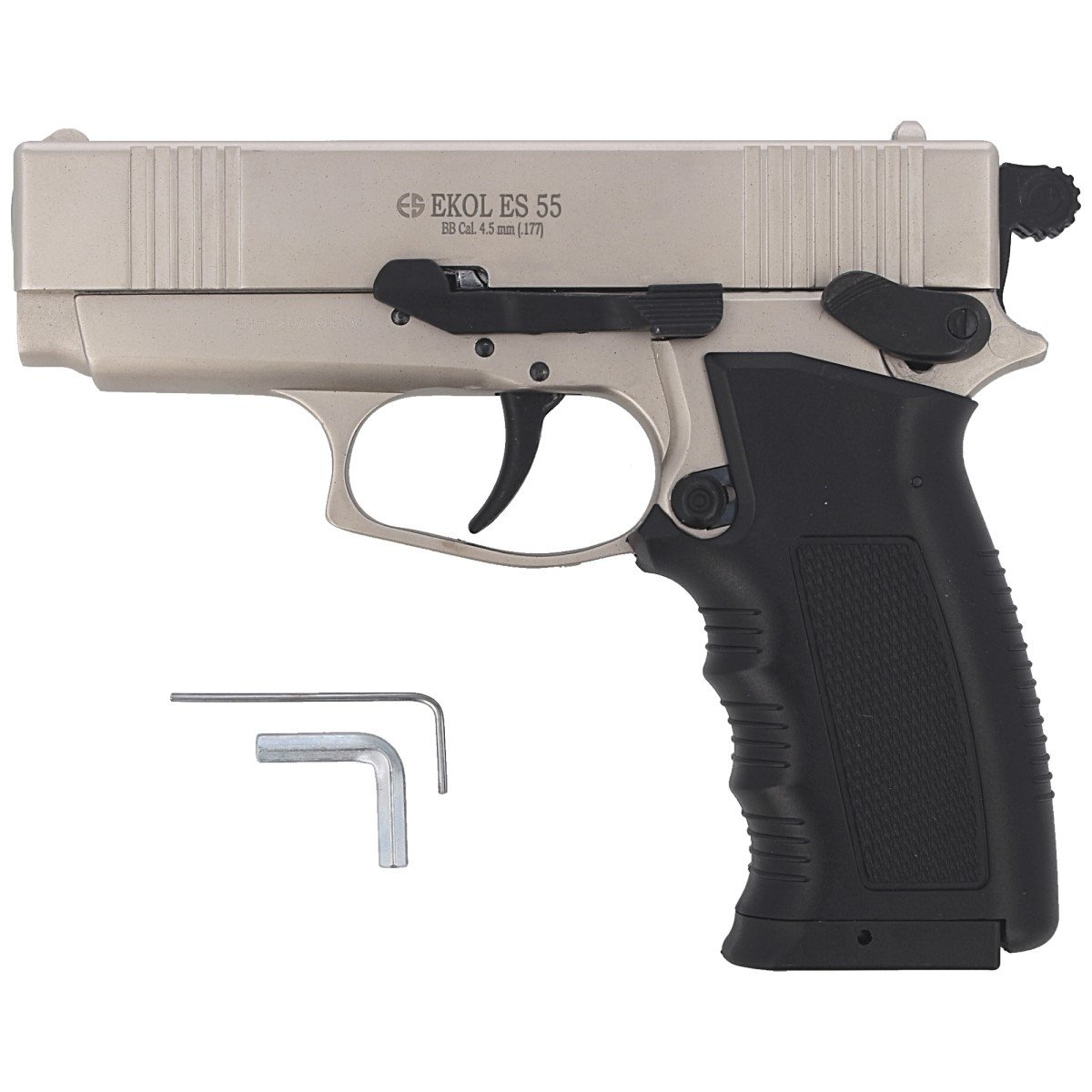 Ekol ES 55 Satin to pistolet pneumatyczny o konstrukcji opartej na broni sygnałowej firmy Voltran. Oferuje realistyczny wygląd oraz solidną konstrukcję, zapewniającą trwałość i niezawodność. Zamek (slide), korpus (frame), kurek (hammer), dźwignia decockera (decocker lever) oraz drobne elementy pistoletu zostały wykonane z metalu. Dzięki tak silnym korzeniom, ta mocna wiatrówka 140 m/s nadaje się zarówno do dynamicznego strzelectwa sportowego jak i treningu taktycznego.
