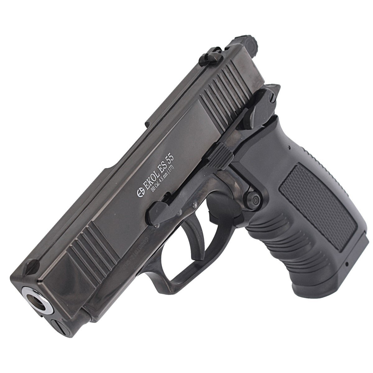 • Ekol ES 55 Czarny - samopowtarzalny pistolet pneumatyczny o konstrukcji opartej na broni sygnałowej. Dzięki tak silnym korzeniom, ten potężny pistolet o prędkości 140 m/s nadaje się do dynamicznego strzelectwa i treningu taktycznego. Metalowy szkielet.