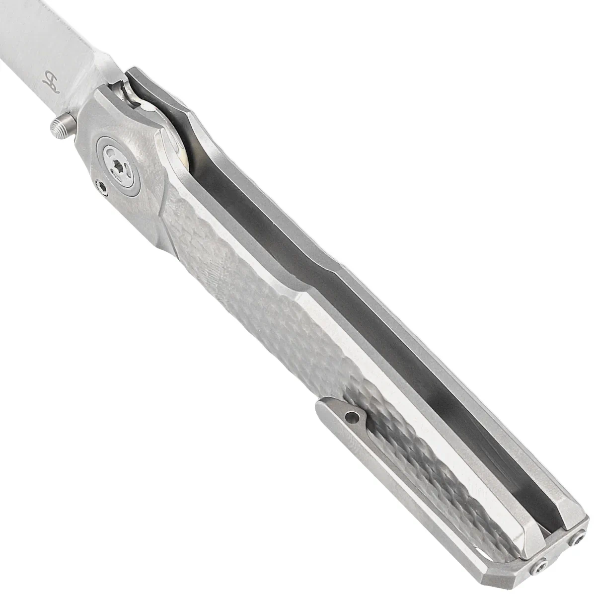 Rękojeść - z jednego kawałka tytanu 6AI4V, obrobionego na frezarkach CNC. Monolityczny szkielet (korpus) o najwyższej wytrzymałości, będący solidnym elementem konstrukcyjnym gwarantującym sztywność i wytrzymałość całej konstrukcji. Tylko nieliczne firmy są w stanie wykonać rękojeść z tak nieprawdopodobną dokładnością! Prostota i solidność konstrukcji dają pewność wieloletniego użytkowania. Powierzchnia fakturowana dla polepszenia jakości chwytu. Klips dwupozycyjny (prawa/lewa), typu deep carry, wykonany z tytanu, umożliwia przenoszenie noża w pozycji tip-up. Oś pivota jest ozdobiona tytanową obręczą barwioną na niebiesko (pivot collar ring).