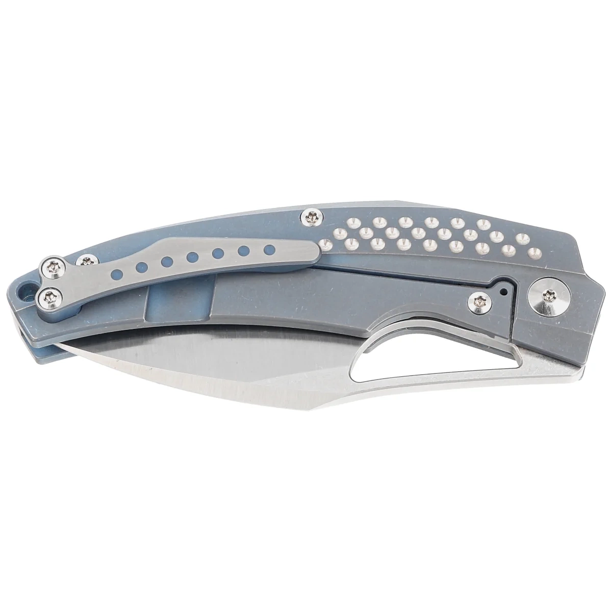 Rękojeść - z tytanu 6AL4V, kunsztowna seria zagłębień dodaje charakteru i zapewnia pewniejszy chwyt. Konturowanie okładek eliminuje ostre krawędzie. Prostota i solidność konstrukcji dają pewność wieloletniego użytkowania. Klips jednopozycyjny (prawa), frezowany z jednego kawałka tytanu, umożliwia przenoszenie noża w pozycji tip-up. Za klipsem znajduje się miejsce do przewleczenia linki zabezpieczającej lub ozdobnej.
