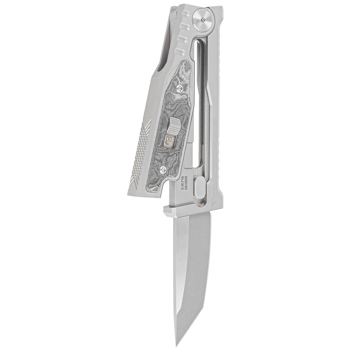 Rękojeść - wykonany na frezarkach CNC tytanowy Exoskeleton, zewnętrzny szkielet z ruchomą górną częścią odpowiadającą za otwieranie i zamykanie noża. Fazowane krawędzie okładek eliminują ostre ranty, a perfekcyjnie dopasowane wkładki z Burl Linen micarty nadają ekskluzywnego charakteru oraz poprawiają pewność uchwytu. Po prawej stronie kunsztowny suwak blokady przesuwnej do wysuwania/wsuwania klingi. Po przesunięciu go w bezpieczną pozycję "lock", nie otworzymy/zamkniemy noża przez przypadek. Jednopozycyjny tytanowy (prawa) klips deep carry umożliwia dyskretne przenoszenie noża w kieszeni w pozycji tip-down (czubkiem ostrza do dołu).