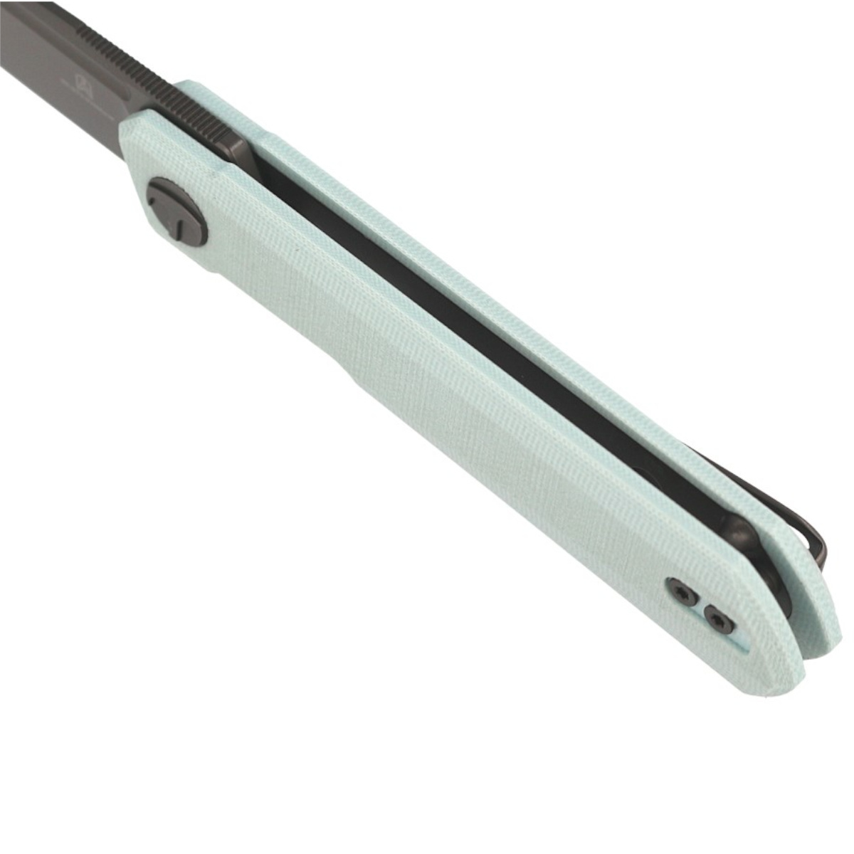 Rękojeść - wykonana z G10, kompozytowego materiału z włókna szklanego prasowanego pod ciśnieniem z syntetyczną żywicą. Agresywna tekstura okładzina zapewnia pewny chwyt, nawet mokrymi dłońmi. Fazowane krawędzie okładek eliminują ostre krawędzie dla wygody, a wykonany z przodu podcięcie na palec poprawia ergonomię. Otwarta konstrukcja tzw. open-backed mocowana stalowymi tulejami dystansowymi redukuję wagę oraz ułatwia czyszczenie. Dwupozycyjny, prawo/lewostronny klips deep carry pozwala przenosić dyskretnie nóż w kieszeni w pozycji tip-up (czubkiem ostrza ku górze).