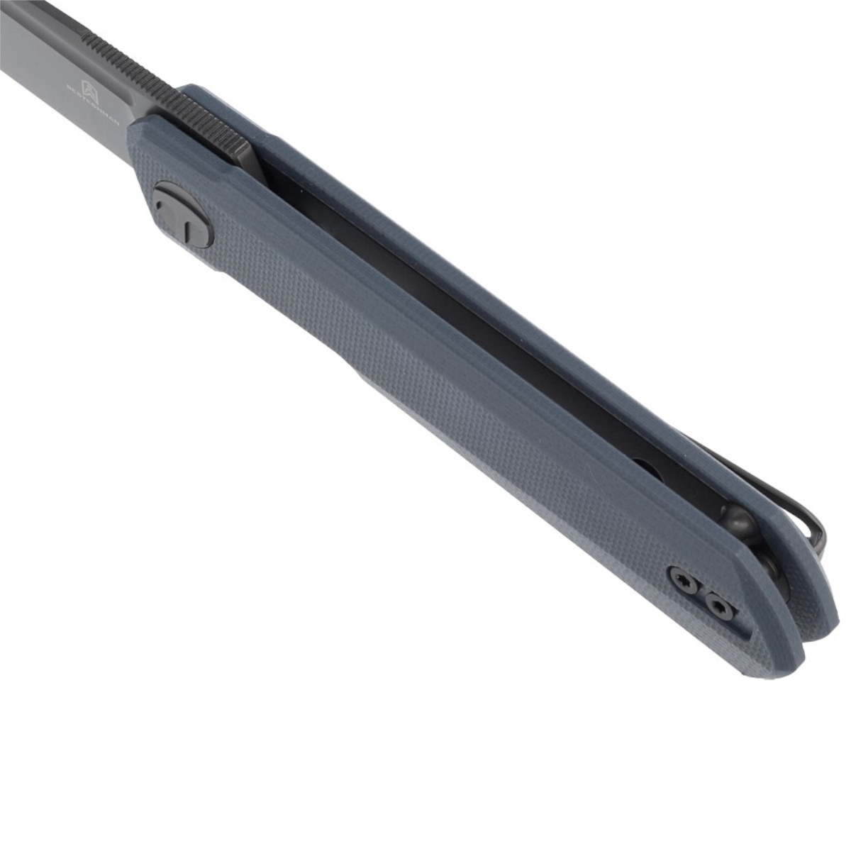 Rękojeść - wykonana z G10, kompozytowego materiału z włókna szklanego prasowanego pod ciśnieniem z syntetyczną żywicą. Agresywna tekstura okładzina zapewnia pewny chwyt, nawet mokrymi dłońmi. Fazowane krawędzie okładek eliminują ostre krawędzie dla wygody, a wykonany z przodu podcięcie na palec poprawia ergonomię. Otwarta konstrukcja tzw. open-backed mocowana stalowymi tulejami dystansowymi redukuję wagę oraz ułatwia czyszczenie. Dwupozycyjny, prawo/lewostronny klips deep carry pozwala przenosić dyskretnie nóż w kieszeni w pozycji tip-up (czubkiem ostrza ku górze).