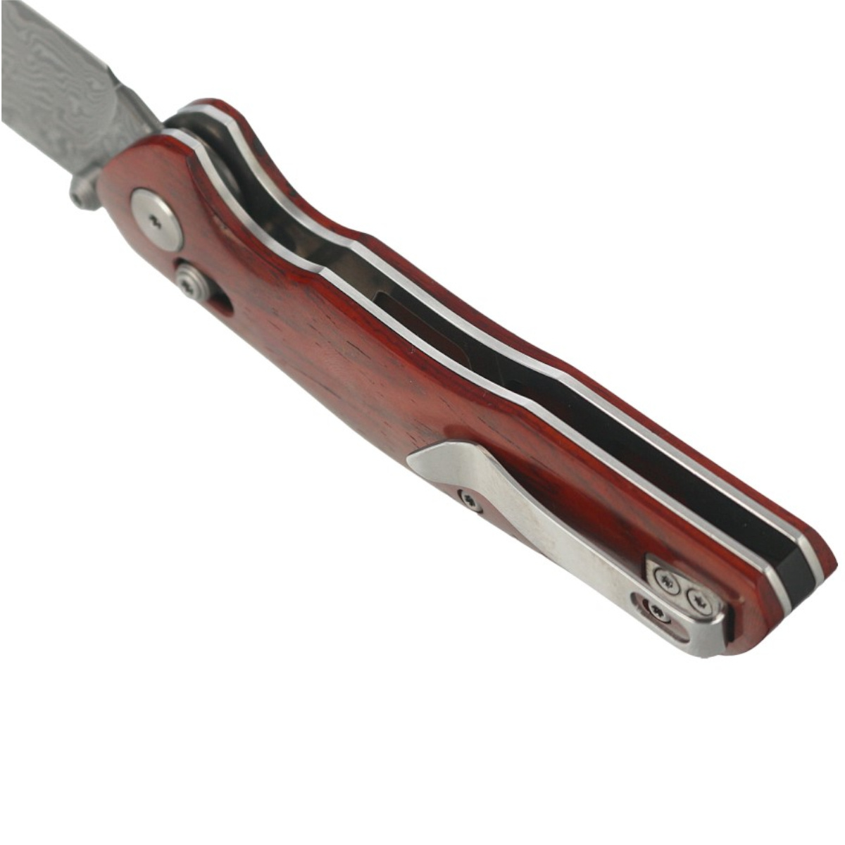 Rękojeść - okładziny z drewna Rosewood o niepowtarzalnym splocie słojów, przykręcono do stalowej ramy noża. Masywny backspacer do którego przymocowano okładziny gwarantuje sztywność i wytrzymałość całej konstrukcji. Prosta, solidna konstrukcja daje pewność wieloletniego użytkowania. Pivot ozdobiony stylizowanym logo producenta. Jednopozycyjny (prawa) stalowy klips deep carry pozwala przenosić dyskretnie nóż w kieszeni w pozycji tip-up (czubkiem ostrza do góry).