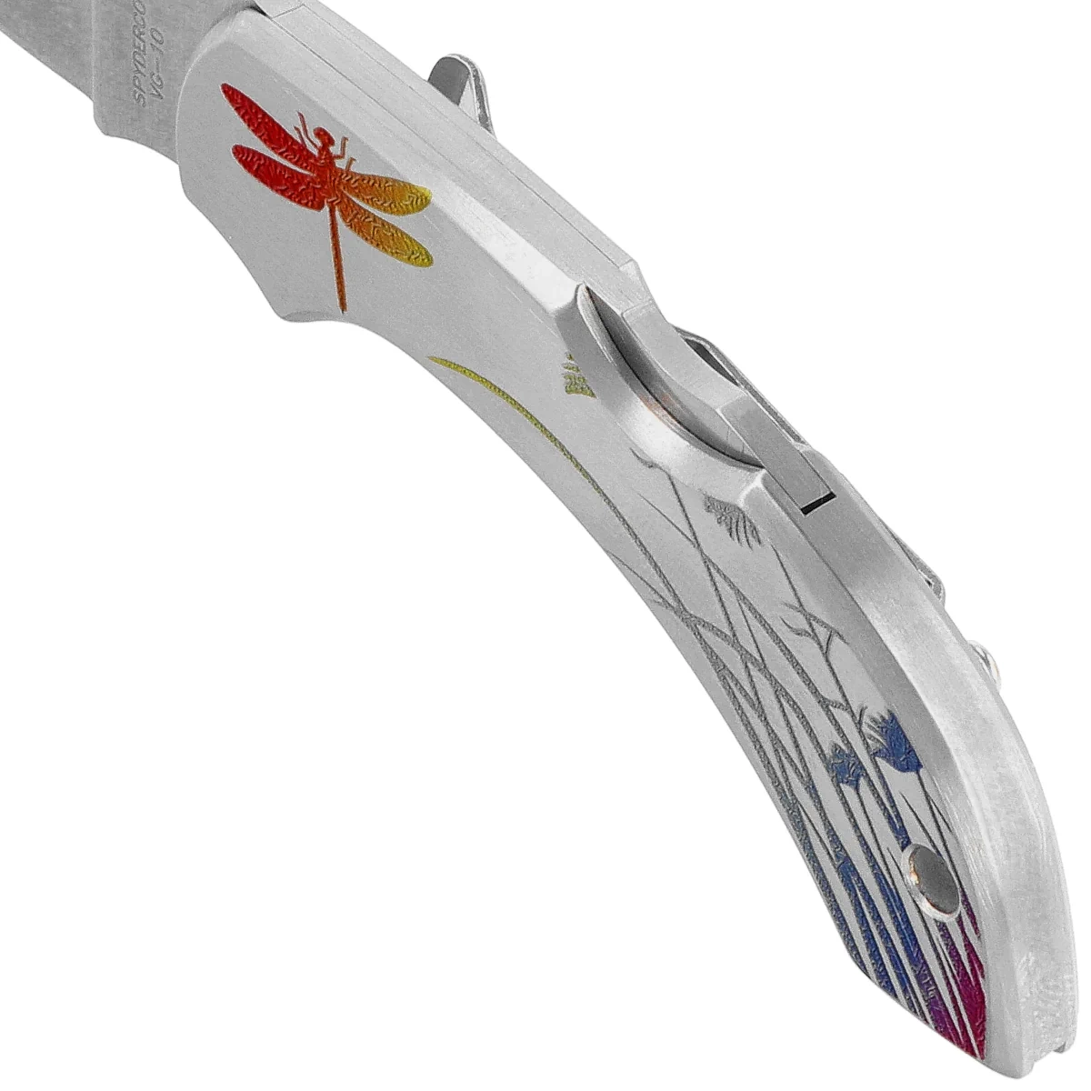 Rękojeść - okładziny wykonany ze stali nierdzewnej stainless steel, ozdobione kolorowym grawerunkiem ważki. Bezpieczeństwo użytkowania zwiększa ergonomiczne profilowana rękojeść zapewniająca wygodny i pewny chwyt. Nóż wyposażono w przykręcany metalowy klips (prawostronny) pozwalający przenosić nóż w pozycji tip-up (czubkiem ku górze). W tylnej części rękojeści znajduję się otwór na linkę.
