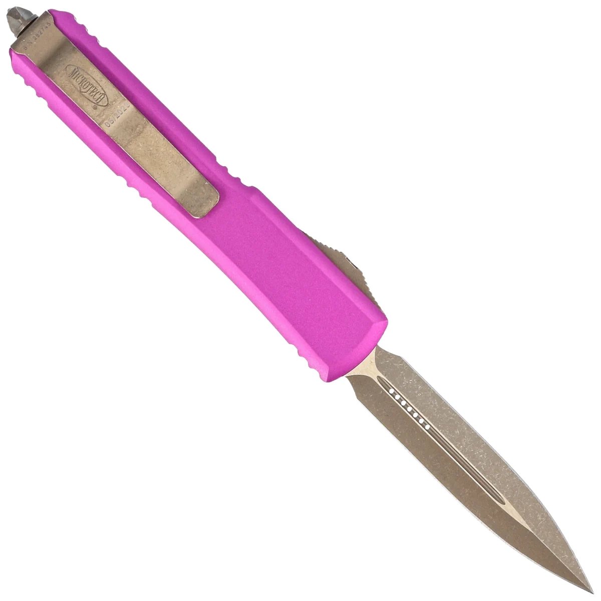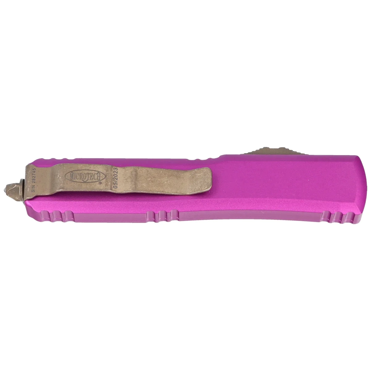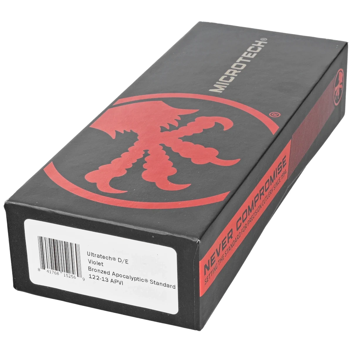 - Ultratech D/E Violet Aluminium, Bronzed Apocalyptic to pełnowymiarowy nóż automatyczny OTF z serii Ultratech. Pracujący w trybie D/A, wyposażony w piekielnie szybki mechanizm wysuwający ostrze. Projekt Tony Marfione właściciela Microtech Knives
