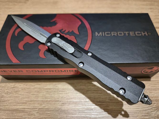 Rękojeść - wykonana z doskonałą precyzją w technologii 3D na frezarkach CNC, z anodyzowanego na czarno aluminium 6061-T6. Faktura powierzchni rękojeści powoduje, że nóż nie ślizga się w dłoni podczas używania. Na grzbiecie i dole rękojeści znajdują się nacięcia (jimping) dla pewniejszego chwytu. Charakterystyczne jest umiejscowienie suwaka slidera, w zagłębieniu wyfrezowanym na boku rękojeści. Dzięki temu ręka układa się naturalniej przy otwieraniu i zamykaniu noża. Smukły profil oraz frezowany dwupozycyjny (prawa/lewa) masywny klips typu deep carry, umożliwiają dyskretne przenoszenie noża w kieszeni, w pozycji tip-down (czubkiem ostrza do dołu). Na klipsie znajduje się logo Microtech, numer seryjny i data produkcji. Rękojeść zakończono zbijakiem do bicia szyb, masywny stalowy trójkąt, w który wprasowano kulkę z węglika wolframu.