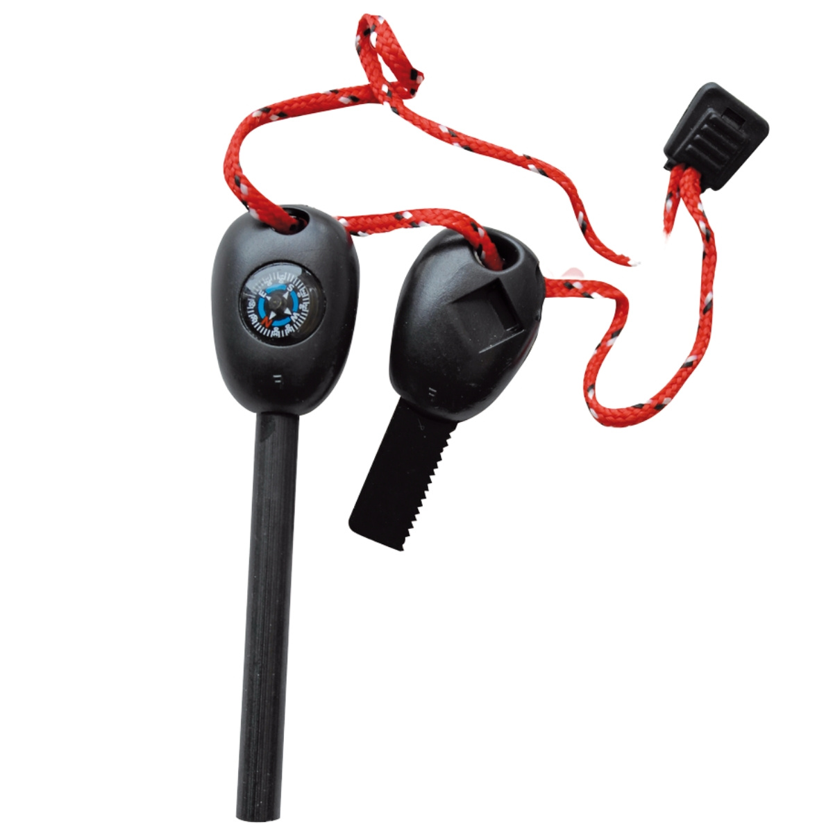 • Prosty w obsłudze, uniwersalny zestaw Fire Starter w czarnym kolorze. Wyposażony w krzesiwo magnezowe, gwizdek sygnalizacyjny, mini kompas, miarkę oraz uniwersalną mini piłę. Niezbędny element wyposażenia każdego miłośnika survivalu.