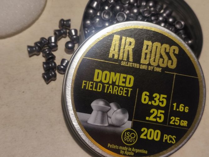 Air Boss Domed Field Target .25 precyzyjny, śrut typu Round (zaokrąglony) w kalibrze 6.35 mm. Indywidualnie selekcjonowany, sztuka po sztuce (Selected One by One) śrut klasyPremium o współczynniku balistycznym (BallisticCoefficient)BC:0.030. Zaprojektowany do strzelania na zawodach Field Target, HFT(zapewnia doskonałe skupienie) oraz do polowań na szkodniki. Metalowepudełko, 200 sztuk.