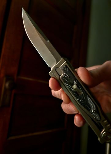 Głownia - szlifowana maszynowo typu S/E (Single Edge) Drop Point z obustronnie ostrzonymi krawędziami. Wykończona elegancką metodą satynowania, o gładkiej, półmatowej powierzchni. Wydłużony brzusiec zwiększa długość krawędzi tnącej w stosunku do smukłej klingi, zbiegając się w kierunku czubka ostrego jak igła. Odpowiednia grubość klingi zapewnia wysoką wytrzymałość, natomiast wysoki, płaski szlif gwarantuje doskonałą geometrię krawędzi tnącej oraz ekstremalną wydajność cięcia. Blokowanie mechaniczne realizowane jest poprzez zatrzaśnięcie fragmentu rękojeści na owalnym kołku blokady.