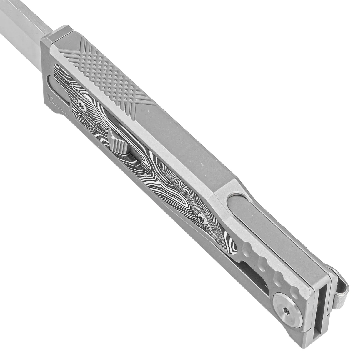 EXO-M Gravity Drop Point Bead Blasted Titanium/Damascus Black-White G10, Satin to intuicyjne otwierany, pomysłowy nóż składany EXO-M (Medium) z legendarnej manufaktury Reate Knives - prawdziwy popis inżynierów w dziedzinie projektowania. Model EXO-M wyposażono w głownią wysuwaną z przodu, aktywowaną siłą grawitacji. Konstrukcja inspirowana jest grawitacyjnym nożem lotniczym Luftwaffe, potocznie nazywanym nożem niemieckich spadochroniarzy. Intuicyjne wysuwanie i wsuwanie ostrza jedną ręką, odbywające się pod wpływem siły ciężkości oraz zastosowanie najwyższej klasy materiałów tworzą całość o niezrównanej jakości charakterystycznej dla marki Reate.
