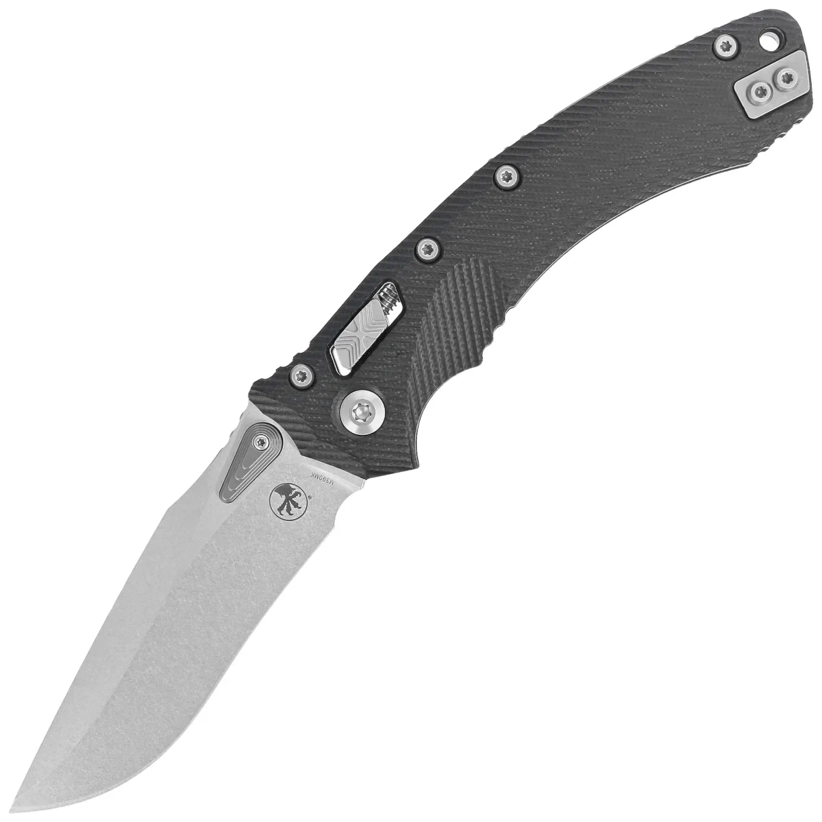 Rękojeść - wykonana z wytrzymałego kompozytu G10, dla lepszego uchwytu pokryta wyfrezowanymi liniami (Fluted). Szeroki suwak blokady z charakterystyczną dla firmy Microtech schodkową strukturą X. Obie okładziny zostały skręcone przy pomocy solidnego, backspacera. Dwustronny (prawa / lewa) tytanowy klips pozwala dyskretnie nosić nóż w pozycji tip-up. Nad klipsem lanyard hole, miejsce na linkę zabezpieczającą lub ozdobną.