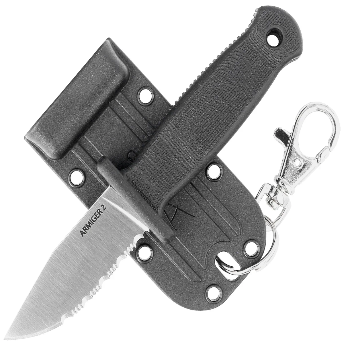 - Armiger 2 Clip Point Black Thermal Plastic Rubber, Satin Serrated kompaktowy nóż typu neck knife. Budowa full tang, wygodna rękojeść zapewniająca pewny uchwyt. Pochwa z kydexu z karabińczykiem. Projekt byłego projektanta firmy Cold Steel, Andrew Demko.