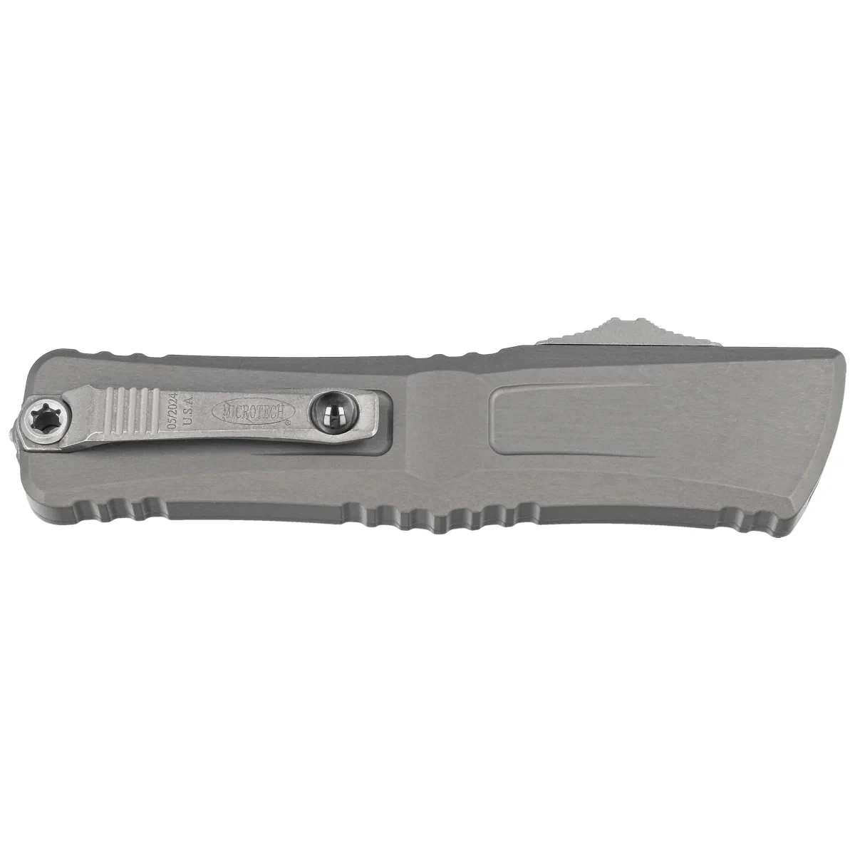 Rękojeść - wykonana z doskonałą precyzją w technologii 3D na frezarkach CNC z 6061-T6 AluminiumFaktura powierzchni rękojeści oraz głębokie nacięcia (jimping) na niej sprawiają, że nóż nie ślizga się w dłoni podczas używania. Smukły profil oraz frezowany dwupozycyjny (prawa/lewa) masywny klips typu deep carry, umożliwiają dyskretne przenoszenie noża w kieszeni, w pozycji tip-down (czubkiem ostrza do dołu). Na klipsie znajduje się logo Microtech, numer seryjny i data produkcji. Rękojeść zakończono zbijakiem do bicia szyb, masywny stalowy trójkąt, w który wprasowano kulkę z węglika wolframu. Znajduję się w nim również otwór do przeplecenia linki ozdobnej.