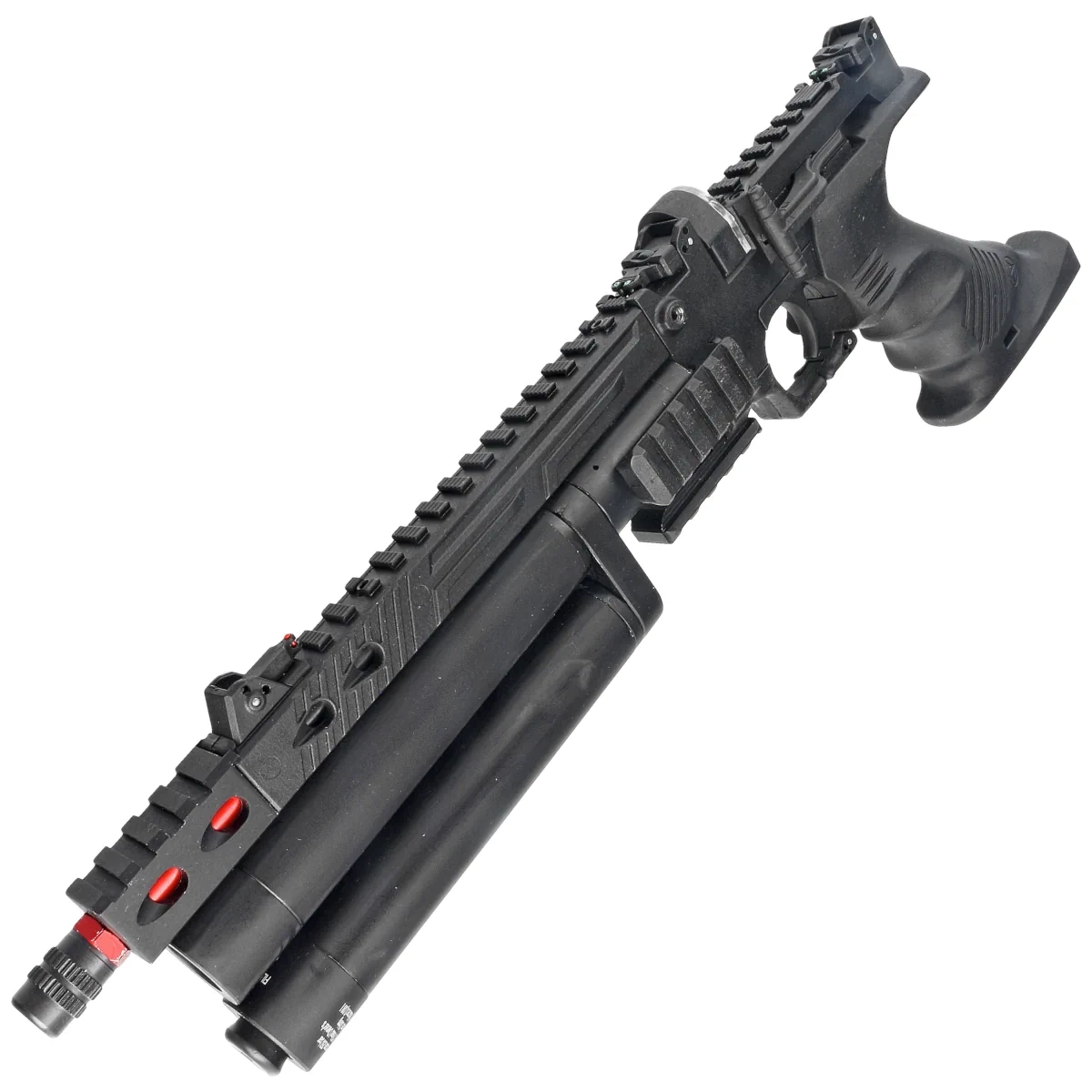 Szyny montażowe - zamocowane po obu stronach zasobnika sprężonego powietrza kartusza 22mm szyny picatinny umożliwiają zamocowanie dodatkowych akcesoriów.