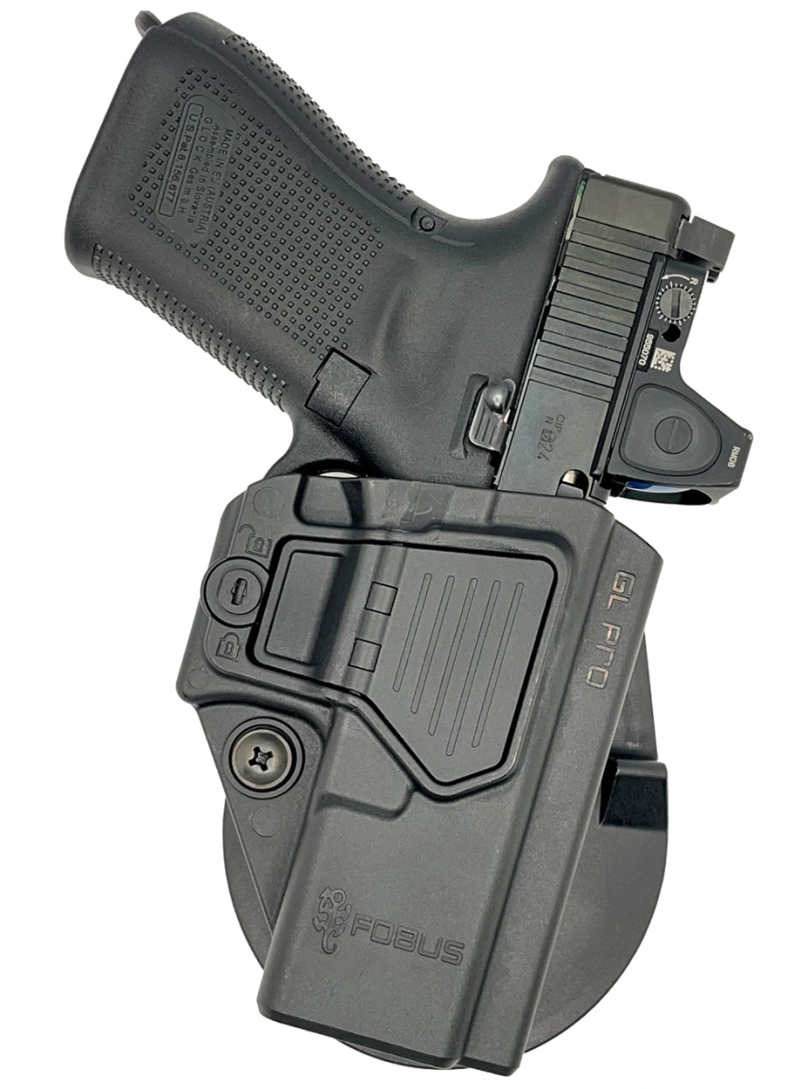 - GLPRO (Paddle) kabura otwarta Fobus - prawa. Do Glock 17, 19, 19X, 26, 45. Kabura zewnętrzna o niskim profilu, z regulacją siły docisku oraz przełączanej pasywnej / aktywnej blokadzie. Zaprojektowana do broni z kolimatorem i podwyższoną muszką