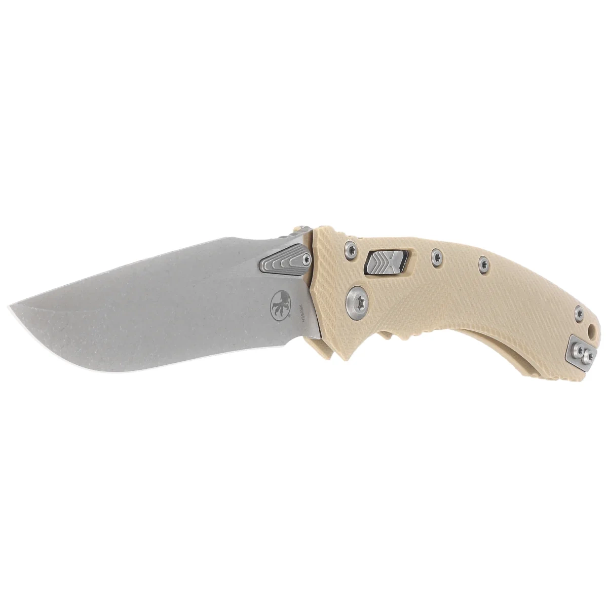 Rękojeść - wykonana z wytrzymałego kompozytu G10, dla lepszego uchwytu pokryta wyfrezowanymi liniami (Fluted). Szeroki suwak blokady z charakterystyczną dla firmy Microtech schodkową strukturą X. Obie okładziny zostały skręcone przy pomocy solidnego, backspacera. Dwustronny (prawa / lewa) tytanowy klips pozwala dyskretnie nosić nóż w pozycji tip-up. Nad klipsem lanyard hole, miejsce na linkę zabezpieczającą lub ozdobną.
