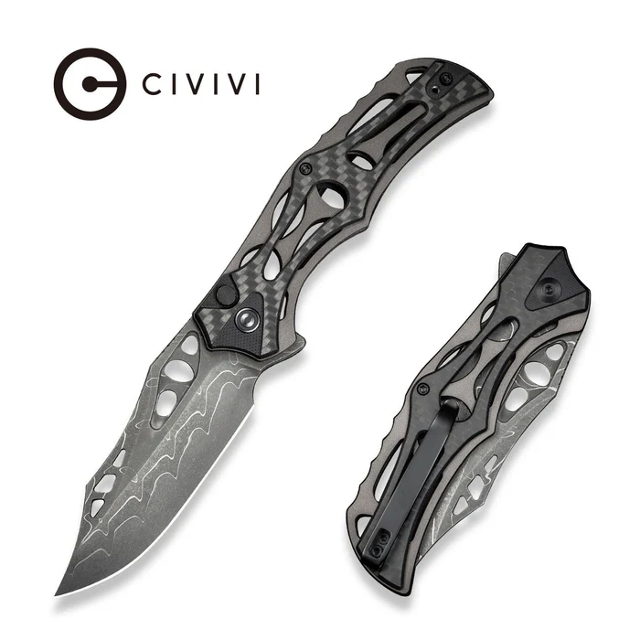 Rękojeść - szkieletowa, z aluminium, do którego przykręcono mocno powycinane okładziny z kompozytu G10 pokrytego warstwą Twill Carbon Fiber. Dzięki temu palce mają dużo punktów podparcia dla pewnego chwytu. Wykonane z przodu podcięcie na palec (fore finger groove) poprawia ergonomię. Otwarta konstrukcja tzw. open-backed mocowana stalowymi tulejami dystansowymi redukuję wagę oraz ułatwia czyszczenie. Prosta, pewna budowa daje pewność wieloletniego użytkowania. Dzięki tym wszystkim zabiegom konstrukcyjnym pełnowymiarowy folder osiąga oszałamiającą wagę 75g. Oś pivota zdobi stylizowane logo marki Civivi. Dwupozycyjny (prawa/lewa), klips deep carry pozwala przenosić dyskretnie nóż w kieszeni w pozycji tip-up (czubkiem ostrza do góry).