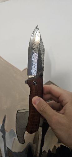Głownia - szeroka, typu Clip Point o wyraźnie zaznaczonym brzuchu, wykończona trawieniem w kwasie dla wydobycia niepowtarzalnych wzorów damastu. Niewielka grubość klingi w połączeniu z wysokim, wklęsłym szlifem daje doskonałą geometrię krawędzi tnącej oraz ekstremalną wydajność cięcia. Ceramiczne łożyska kulkowe wspomagają płynną pracę mechanizmu otwierającego klingę, którą można otworzyć za pomocą szybkiej płetwy flippera (index-finger flipper). Po otwarciu płetwa tworzy mini-gardę zapobiegającą ześlizgnięciu się dłoni na ostrze. Nóż możemy również otworzyć przy pomocy obustronnego kołka w klindze (dual thumb stud). Na grzbiecie klingi upper jimping, karbowane oparcie pod kciuk. Całość blokowana jest solidną blokadą Liner Lock.
