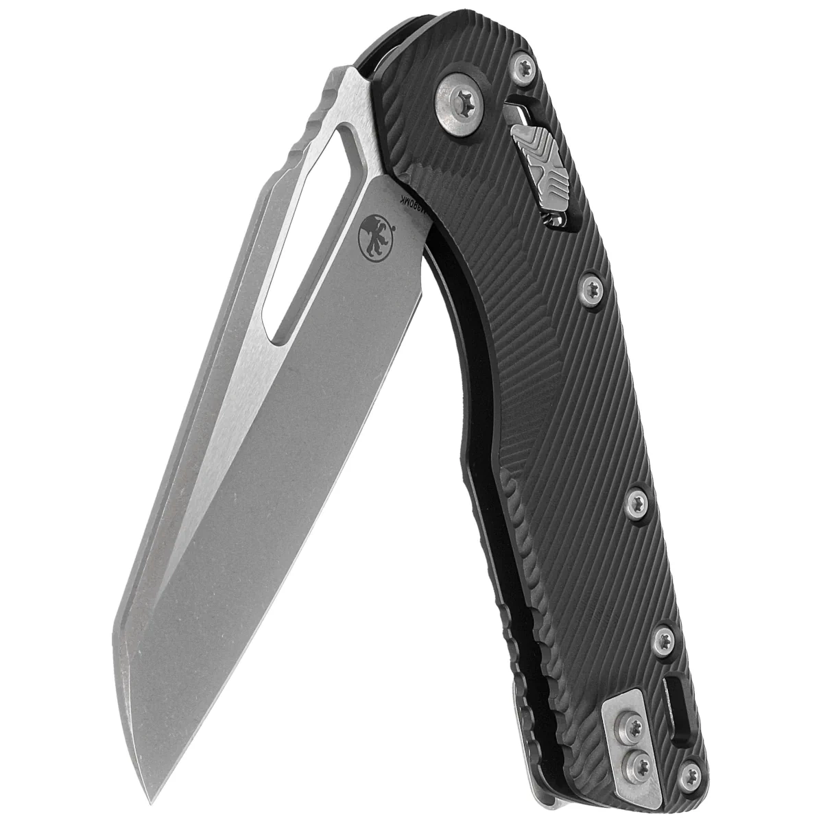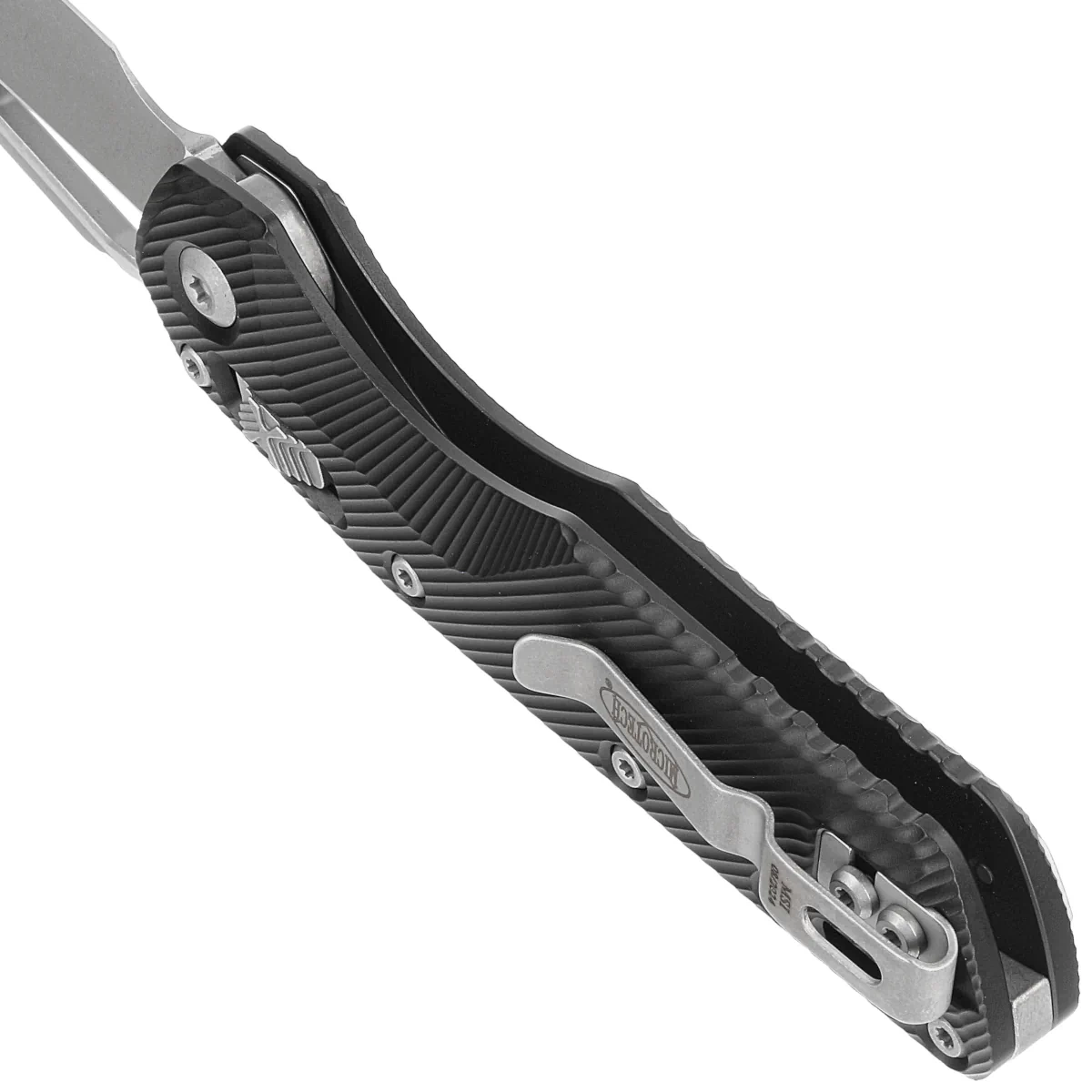 Rękojeść - wykonana z doskonałą precyzją w technologii 3D na frezarkach CNC z anodyzowanego aluminium 6061-T6, dla lepszego uchwytu pokryta wyfrezowanymi liniami (Fluted). Szeroki suwak blokady z charakterystyczną dla firmy Microtech schodkową strukturą X. Obie okładziny zostały skręcone przy pomocy solidnego, aluminiowego backspacera. Dwustronny (prawa / lewa) klips pozwala dyskretnie nosić nóż w pozycji tip-up. Nad klipsem lanyard hole, miejsce na linkę zabezpieczającą lub ozdobną.