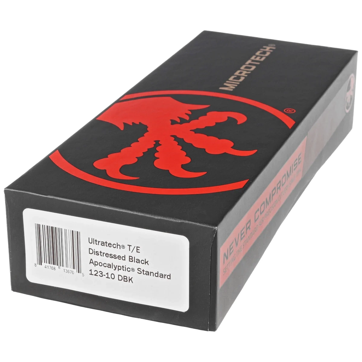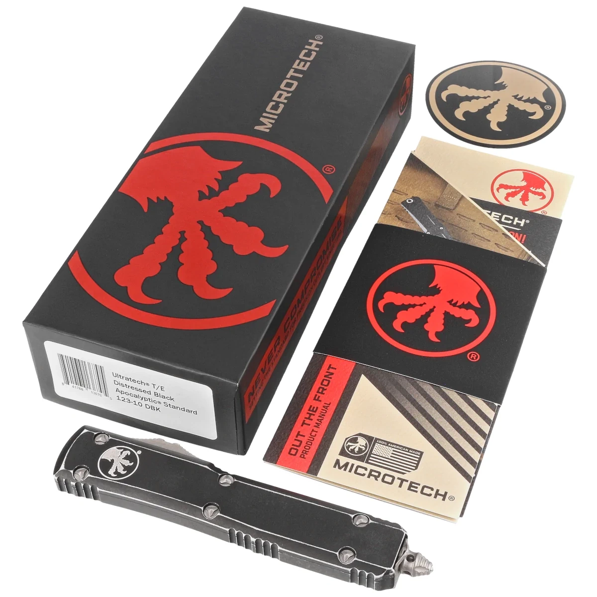 Ultratech T/E Distressed Black Aluminium, Apocalyptic to pełnowymiarowy nóż automatyczny OTF (Out The Front) z serii Ultratech. Wyposażony w piekielnie szybki mechanizm wysuwający ostre jak brzytwa ostrze tanto edge w efektownym patynowani Apocalyptic. Postarzana rękojeść z anodyzowanego na czarno aluminium. W 100% wyprodukowany i zmontowany w USA. Projekt Anthony'ego Marfione, knifemakera i właściciela Microtech Knives.