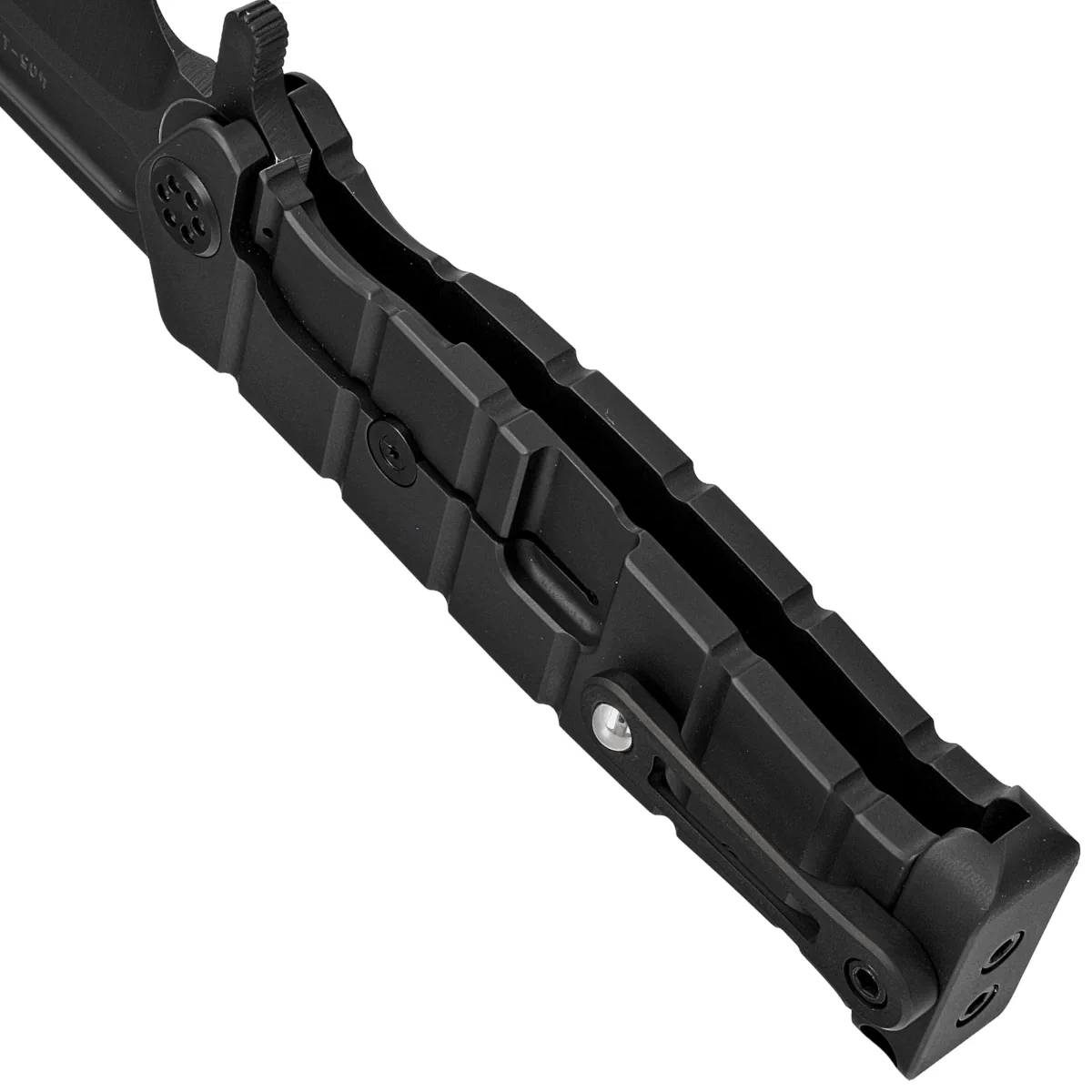 Rękojeść - z litego tytanu została pokryta czarną powłoką DLC. Masywna głowica z tyłu rękojeści odpowiada za balans i wyważenie, może również służyć jako improwizowany młotek lub zbijak do szyb. Całości dopełnia unikalny w formie klips, oczywiście również z tytanu. Śruby podobnie jak klips barwione na czarno.