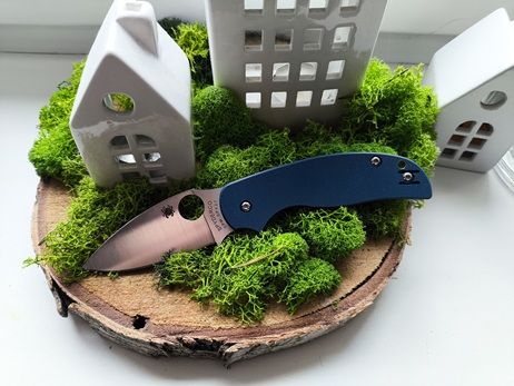 Głownia - o profilu Leaf-Shaped, grubości 3 mm. Ostrze gładkie Plain wyprowadzono szlifem pełnym płaskim (Full Flat Grind) zwiększającym właściwości tnące. Płaski szlif gwarantuje doskonałą geometrię krawędzi tnącej z ostrym czubkiem, redukuje wagę noża oraz prezentuje piękne satynowe wykończenie. Powiększone 14 mm okrągłe wycięcie SpyderHole (patent Spyderco) umożliwia otwarcie noża również mokrymi, spoconymi dłońmi. Finger Choil, łukowate podcięcie pod palec wskazujący oraz karbowana rampa pod kciuk na grzbiecie głowni do sprawnego operowania folderem. Całość blokowana jest przez prostą i sprawdzoną blokadę Liner Lock.