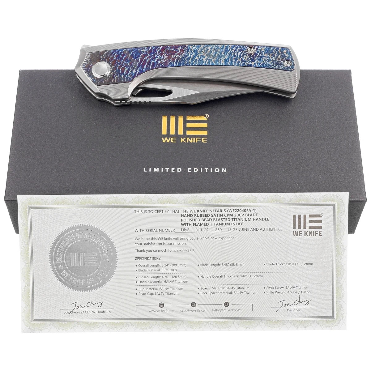 - Nefaris Gray/Flamed Titanium, Hand Rubbed Satin LE. Limitowana edycja WE Knife ograniczona do 260 szt nóż o numerze 057. Perfekcyjne wykonany rękojeść z tytanu z wkładką z barwinego płomieniowo tytanu, klinga stal CPM 20CV.