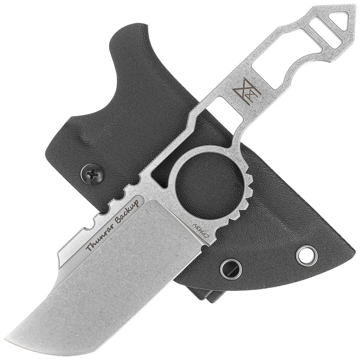 • Thunrar Backup Gray Steel, Satin, mocny, lekki nóż o stałej głowni i monolitycznej budowie. Głownia ze stali nierdzewnej Sandvik 14C28N zapewniającej dobre trzymanie ostrości. Wygodna rękojeść szkieletowa. Płaska pochwa z kydexu z mocowaniem Tek-Lok.