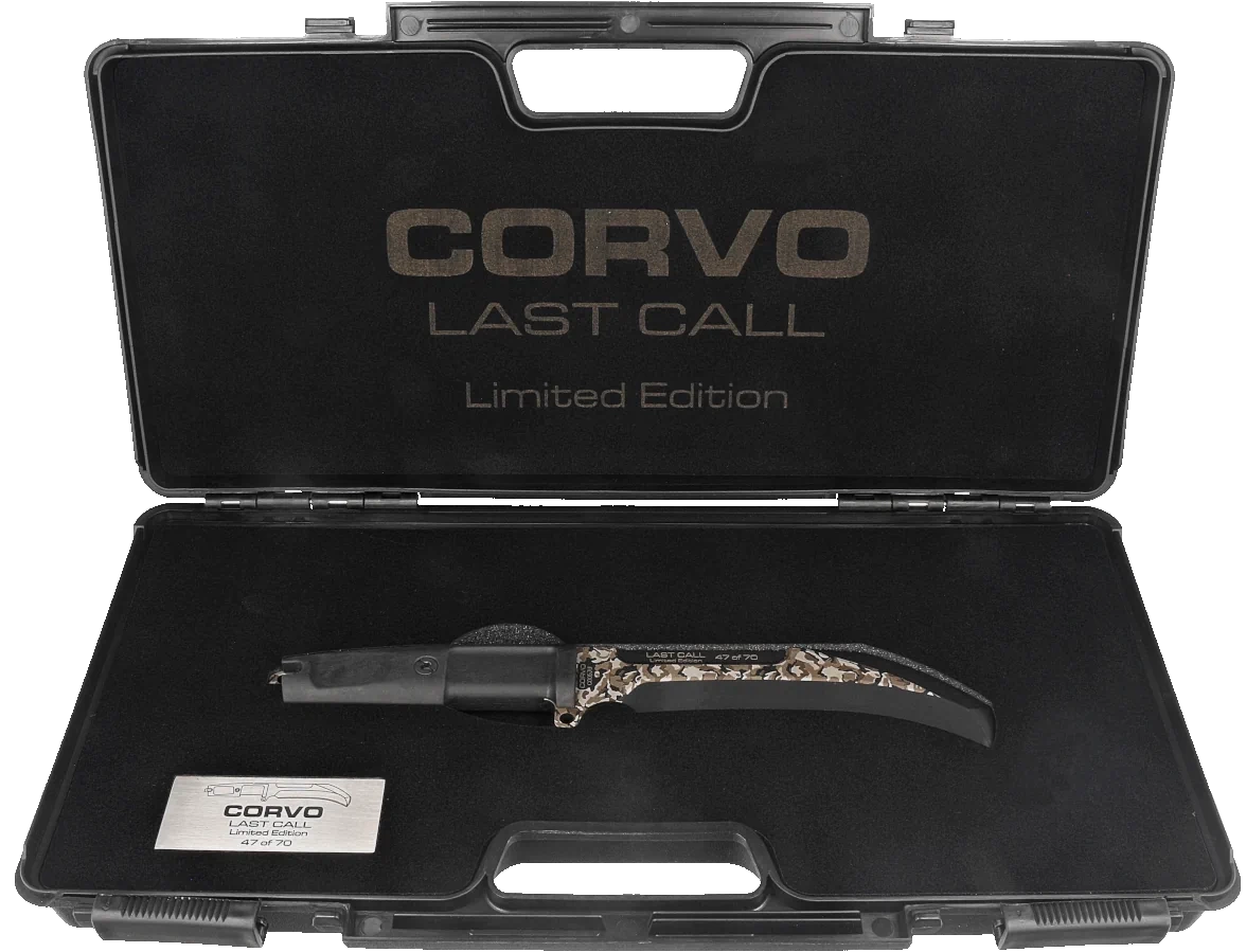 Corvo Last Call LE No 047/70 Black Forprene, Black MIL-C/Geotech Camo, limitowana do 70 sztuk wersja noża armii chilijskiej, używanego m.in. przez siły specjalne. Chilijski szpon śmierci Corvo, udowodnił swoją skuteczność od bitew południowoamerykańskich aż po piaski Iraku. Combat knife z długim zakrzywionym ostrzem, zwężającym się do ostrego punktu dzięki swojej wadze i wyważeniu znakomicie spisuje się podczas aktywności outdoorowej oraz do obrony. Sztych do wbijania i grzebania, ostrze do siekania oraz do strugania.