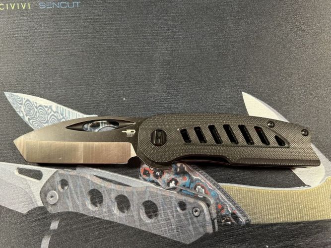 Głownia - typu Tanto, z efektownym wykończeniem Two Tone, szlif satynowany, pozostała część pokryta czarną powłoką. Geometrycznie wyprowadzona krawędź tnąca zbiega się w kierunku ostrego jak igła czubka noża. Grubość klingi zapewnia wysoką wytrzymałość podczas gdy wysoki, płaski szlif daje doskonałą geometrię krawędzi tnącej oraz ekstremalną wydajność cięcia. Łożyska kulkowe wspomagają otwarcie ostrza za pomocą dyskretnej płetwy flippera (index-finger flipper) po otwarciu pełniącej funkcję jelca. Nóż możemy również otworzyć przy pomocy otworu w klindze. Fragment grzbietu klingi pokryto upper jimping, karbowanym oparciem pod kciuk ułatwiającym kontrolę nad nożem. Całość blokowana jest sprawdzoną i popularną blokadą liner lock.