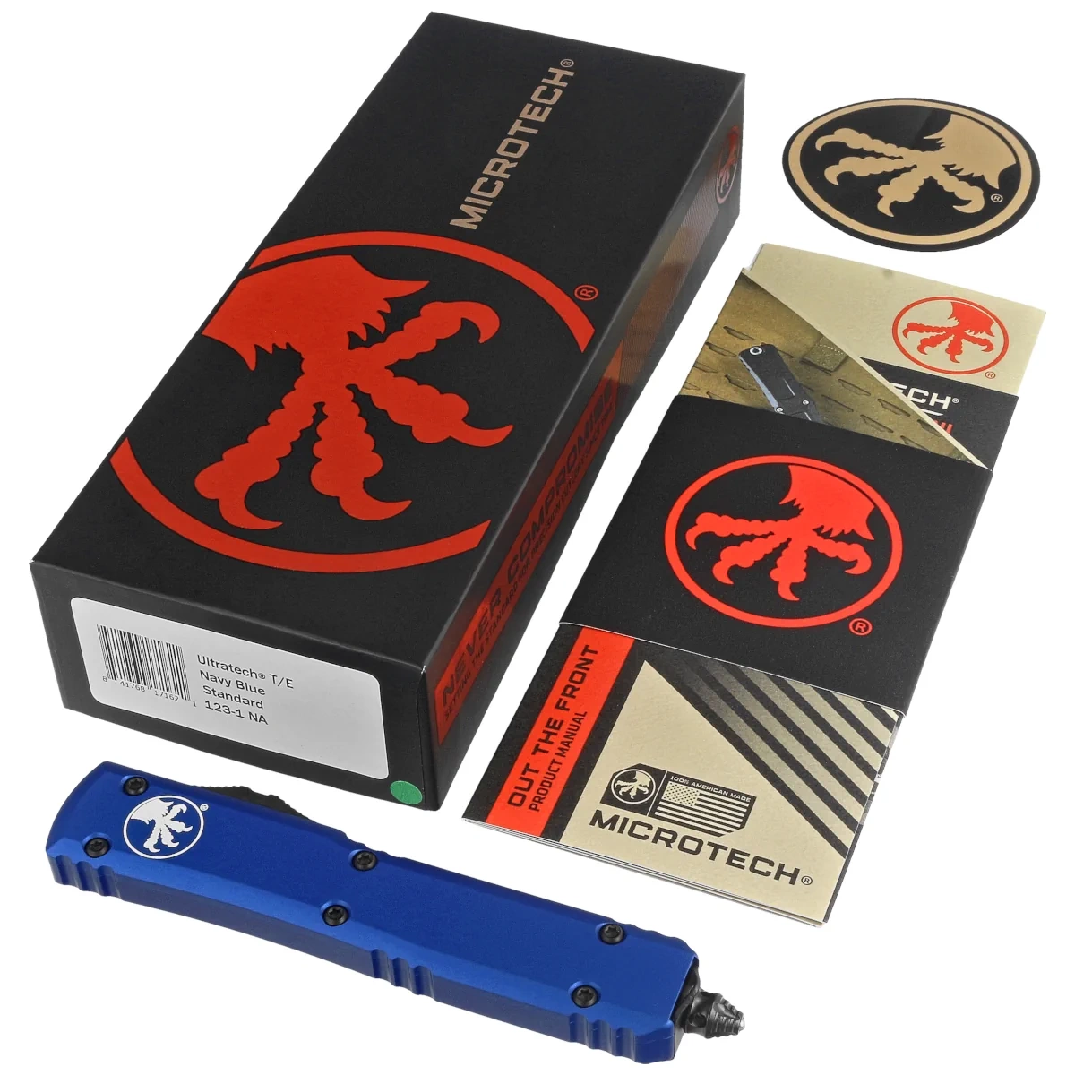 Ultratech T/E Navy Blue Aluminium, Satin to pełnowymiarowy nóż automatyczny OTF (Out The Front) z serii UltratechWyposażony w piekielnie szybki mechanizm wysuwający ostre jak brzytwa ostrze tanto edge w użytkowym wykończeniu Stonewashed. Rękojeść z pokrytego twardą powłoką Mil-Spec aluminium. W 100% wyprodukowany i zmontowany w USA. Projekt Anthony'ego Marfione, knifemakera i właściciela Microtech Knives.