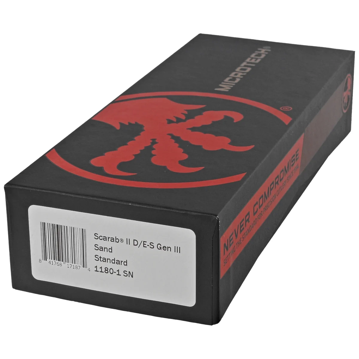 Scarab II Gen III D/E-S Sand Aluminium/3M, Black to szczyt doskonałości w dziedzinie automatycznych noży taktycznych, czerpiący inspirację z oryginalnego projektu Microtech Ultratech. Zbudowany, aby wytrzymać najtrudniejsze warunki, nowy Scarab II jest najlepszym wyborem do intensywnego użytkowania. Zachowując cechy stylistyczne swojego poprzednika, wyznacza nowy standard dla technologii OTF (Out The Front).
