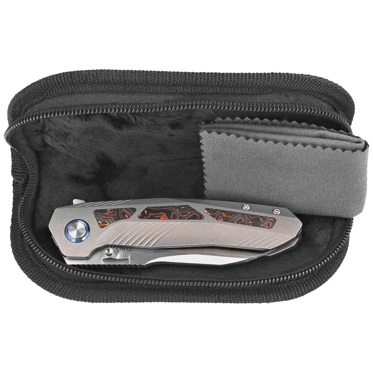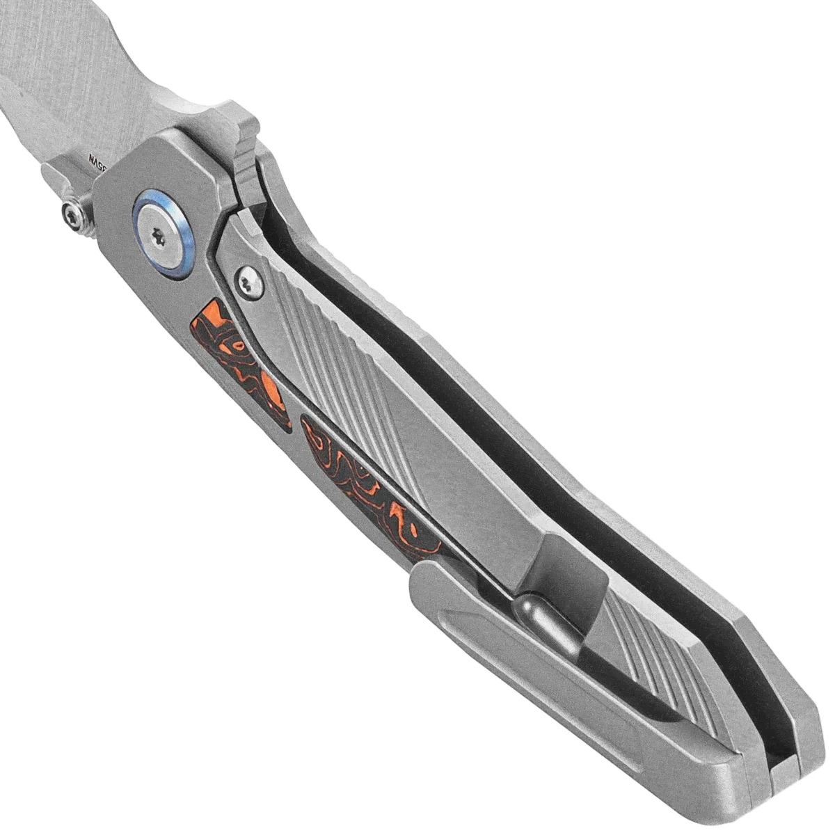 Rękojeść - to grube kawałki tytanu 6AL4V, konturowanie okładek eliminuje ostre krawędzie. Po obu stronach znajduje się inlay (wkładka) wykonana z kompozytu Copper Foil Carbon Fiber. Tylko nieliczne firmy są w stanie wykonać rękojeść z tak nieprawdopodobną dokładnością! Okładziny połączono ze sobą przy pomocy tytanowego backspacera. Prawostronny, jednopozycyjny tytanowy klips deep carry pozwala przenosić dyskretnie nóż w kieszeni w pozycji tip-up (ostrzem do góry). Oś pivota jest ozdobiona tytanową obręczą (pivot collar cap).