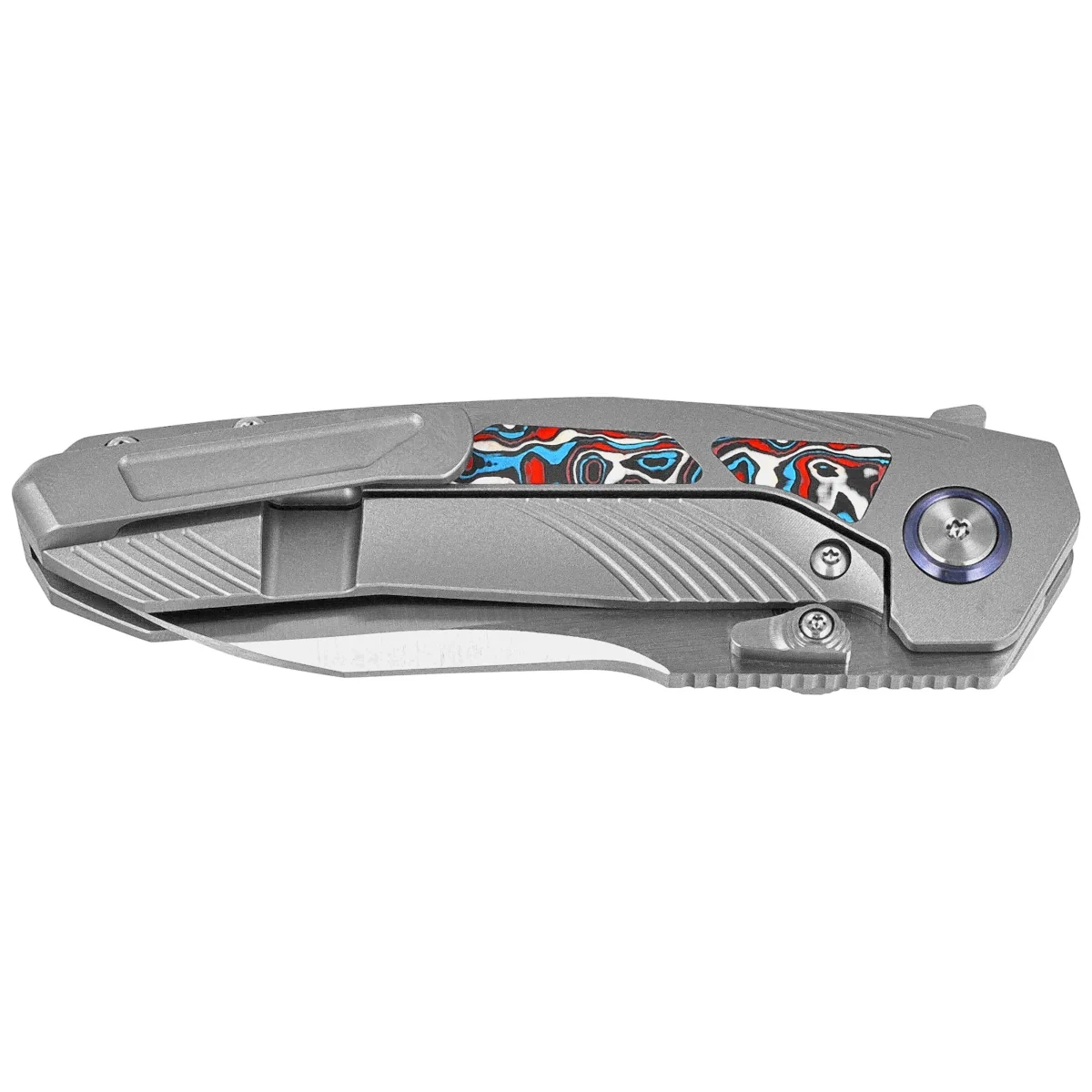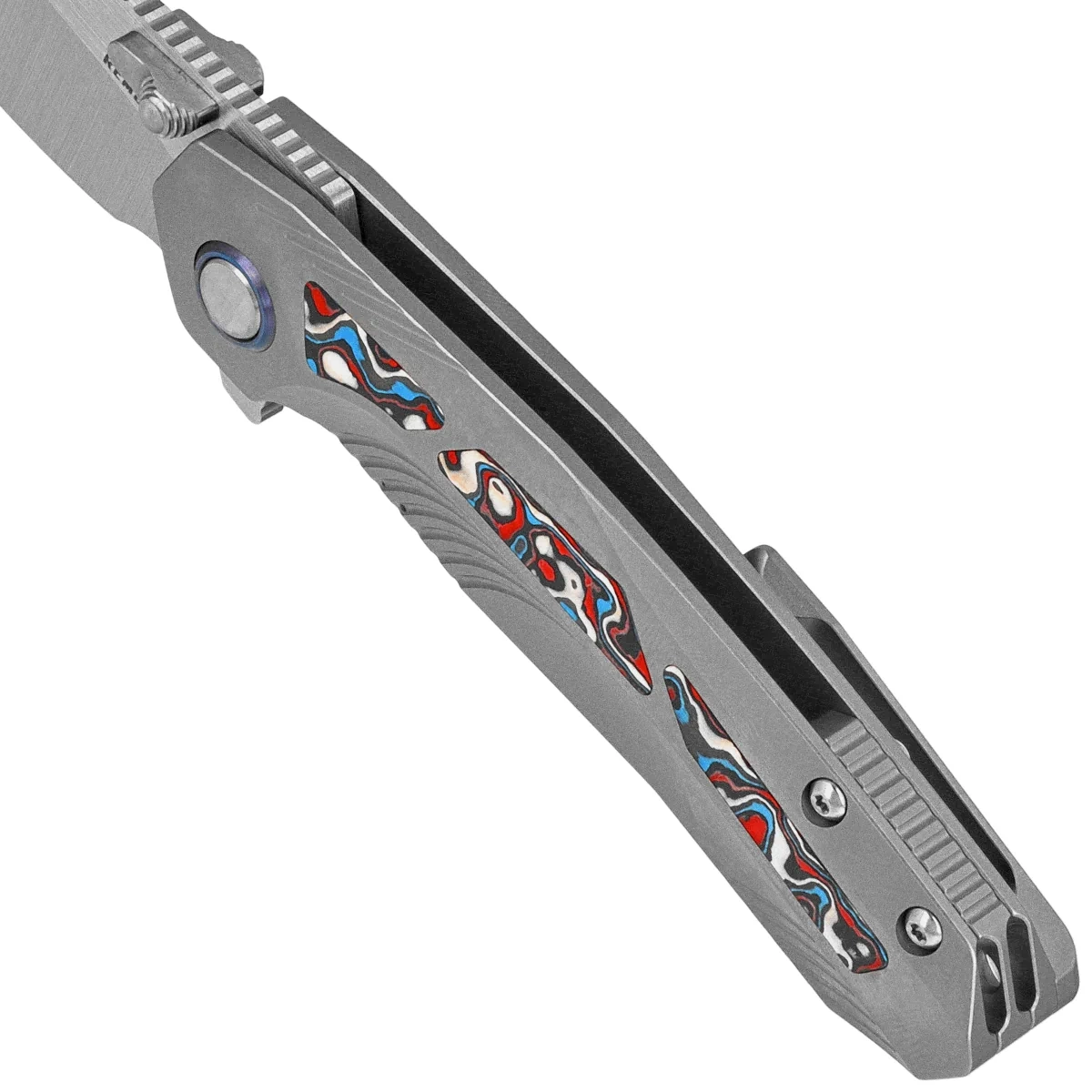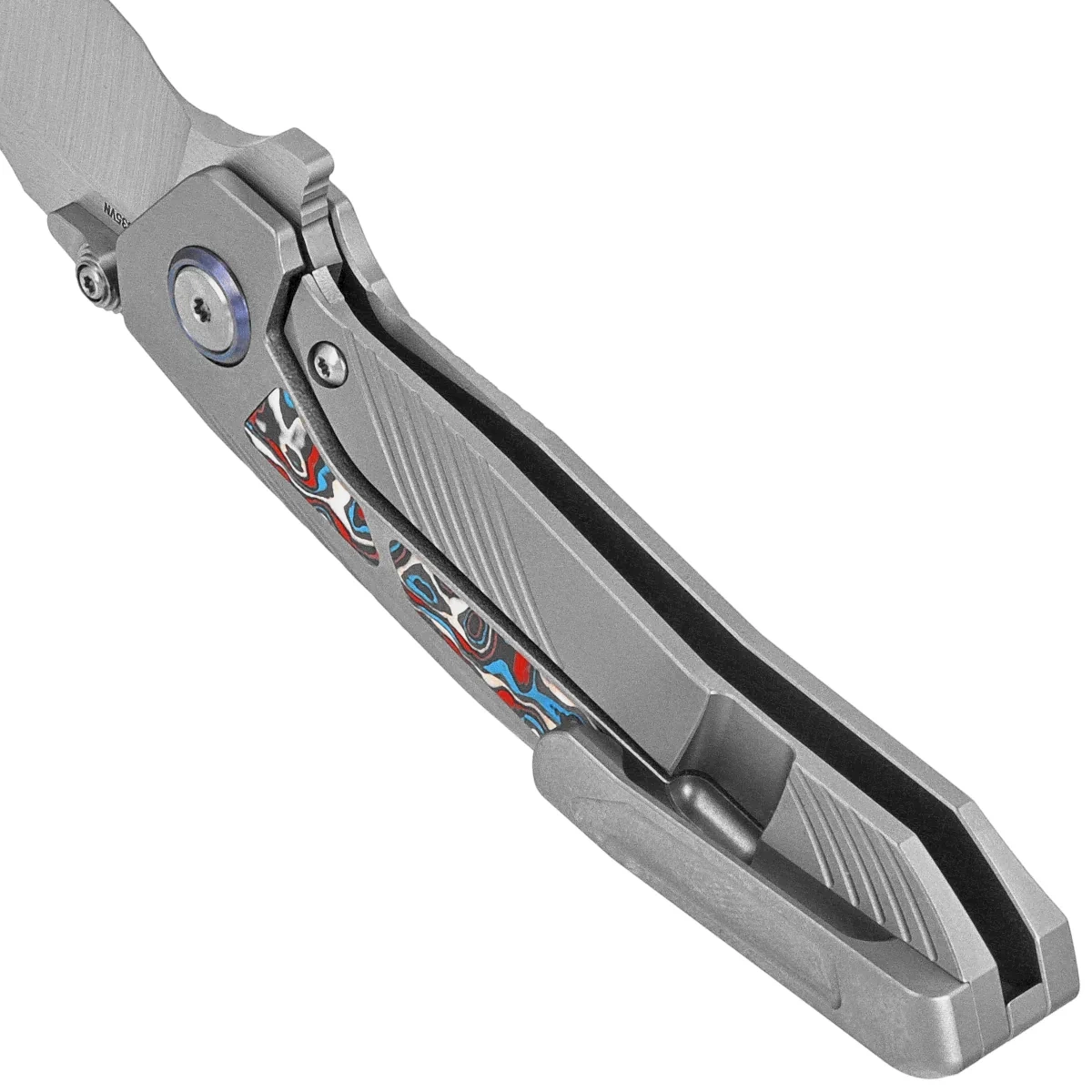 Rękojeść - to grube kawałki tytanu 6AL4V, konturowanie okładek eliminuje ostre krawędzie. Po obu stronach znajduje się inlay (wkładka) wykonana z kompozytu Multicolored Carbon Fiber. Tylko nieliczne firmy są w stanie wykonać rękojeść z tak nieprawdopodobną dokładnością! Okładziny połączono ze sobą przy pomocy tytanowego backspacera. Prawostronny, jednopozycyjny tytanowy klips deep carry pozwala przenosić dyskretnie nóż w kieszeni w pozycji tip-up (ostrzem do góry). Oś pivota jest ozdobiona tytanową obręczą (pivot collar cap).