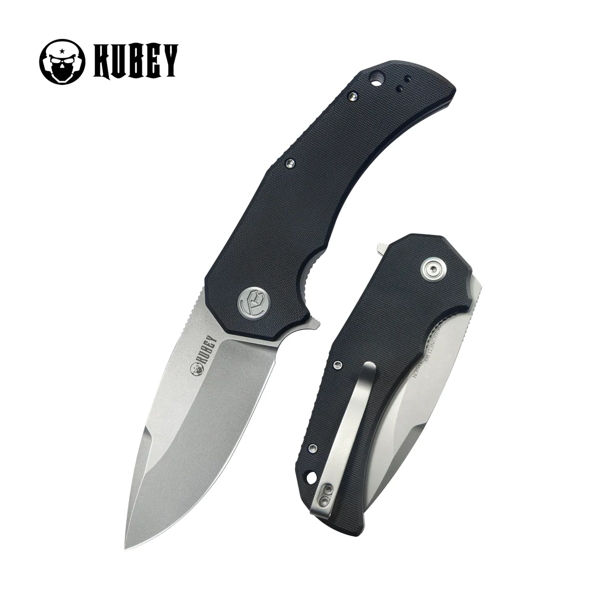 Rękojeść - okładziny z kompozytu G10, materiału niezwykle wytrzymałego mechanicznie i praktycznie całkowicie odpornego na warunki atmosferyczne i działanie chemikaliów, teksturowane dla poprawienia pewności uchwytu, przykręcono do stalowej ramy noża. Fazowane krawędzie okładek eliminują ostre ranty dla wygody i poprawiają pewność uchwytu. Masywny backspacer z G10 do którego przymocowano okładziny gwarantuje sztywność i wytrzymałość całej konstrukcji. Prosta, solidna konstrukcja daje pewność wieloletniego użytkowania. Głębokie podcięcie na palec (fore finger groove) poprawia pewność uchwytu. Oś pivota zdobi stylizowane logo marki Kubey Knife i stalowa nakładka (pivot cap). Dwupozycyjny (prawa/lewa) klips deep carry pozwala przenosić dyskretnie nóż w kieszeni w pozycji tip-up (czubkiem ostrza do góry).
