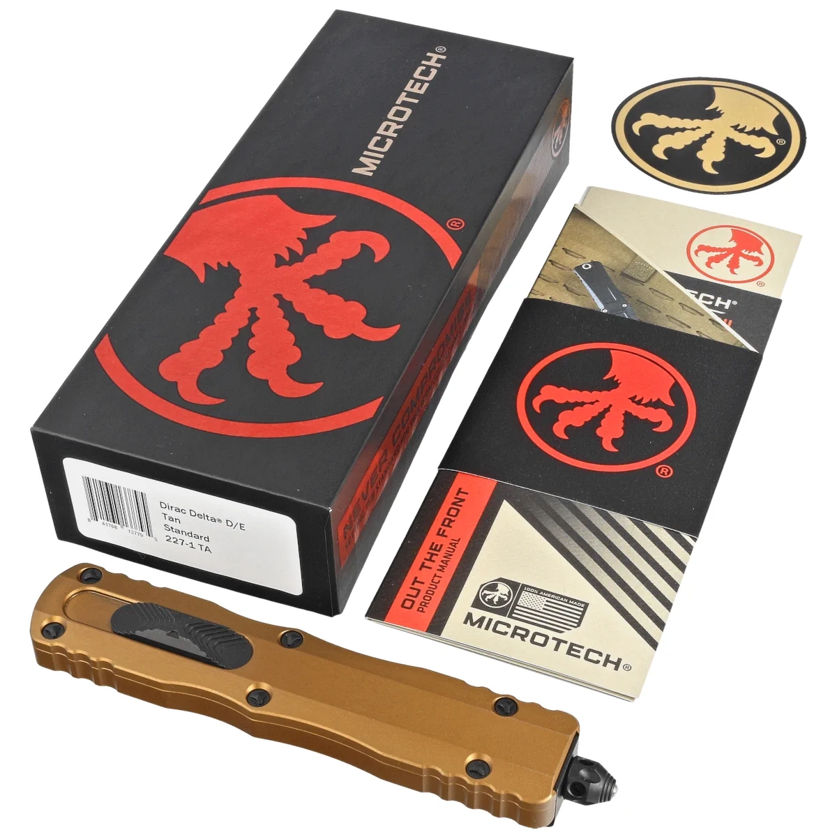 - Dirac Delta D/E Tan Aluminium, Black większa wersja noża automatycznego OTF z serii Dirac. Pracujący w trybie D/A, wyposażony w szybki mechanizm wysuwający ostrze. Przycisk slidera na boku rękojeści. Projekt Tony Marfione, Microtech Knives