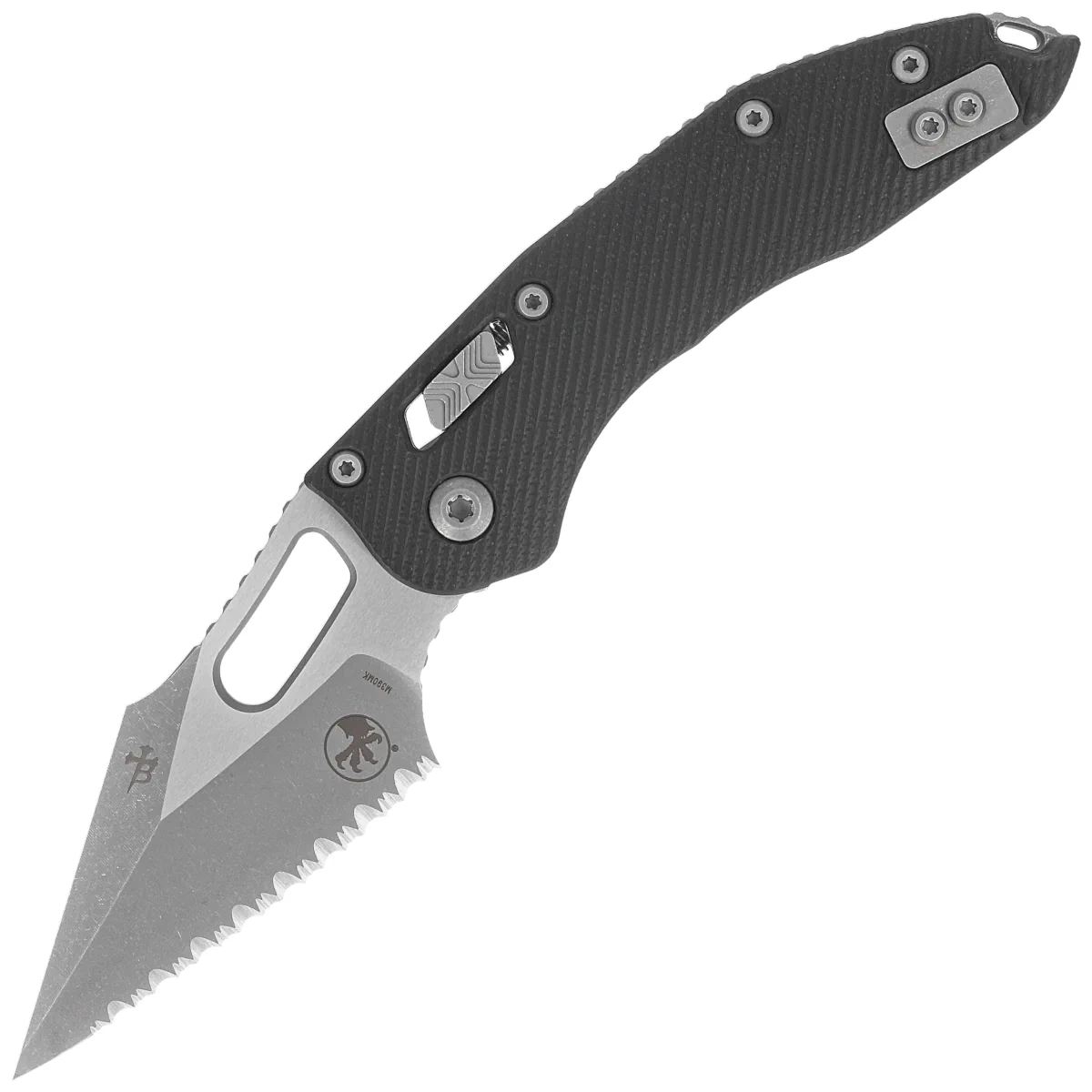 Rękojeść - wykonana na frezarkach CNC z doskonałą precyzją, z kompozytu G10, praktycznie niezniszczalnego tworzywa niewrażliwego na warunki atmosferyczne, odpornego na chemikalia i uszkodzenia mechaniczne, o głęboko frezowanej strukturze 3D Fluted. Szeroki suwak blokady z charakterystyczną dla firmy Microtech schodkową strukturą X. Obie okładziny zostały skręcone przy pomocy solidnego, aluminiowego backspacera. Dwustronny (prawa / lewa) klips pozwala dyskretnie nosić nóż w pozycji tip-up. Wystający fragment backspacera w którym znajduje się otwór na linkę, może również służyć za improwizowany zbijak do szkła.
