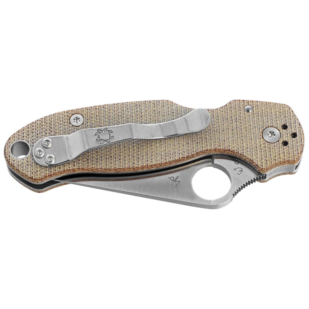 Głownia - o zmodyfikowanym profilu Clip Point, wykończona eleganckim satynowaniem. Ostrze gładkie Plain wyprowadzono szlifem pełnym płaskim (Full Flat Grind) zwiększającym właściwości tnące oraz redukującym masę noża. Powiększone 14 mm okrągłe wycięcie SpyderHole (patent Spyderco) do otwarcia noża, również w rękawicy. Karbowane podparcie pod kciuk, rampa (spine jimping) oraz (finger choil jimping), karbowane podcięcie pod palec wskazujący między rękojeścią a krawędzią tnącą ułatwiają pracę nożem.