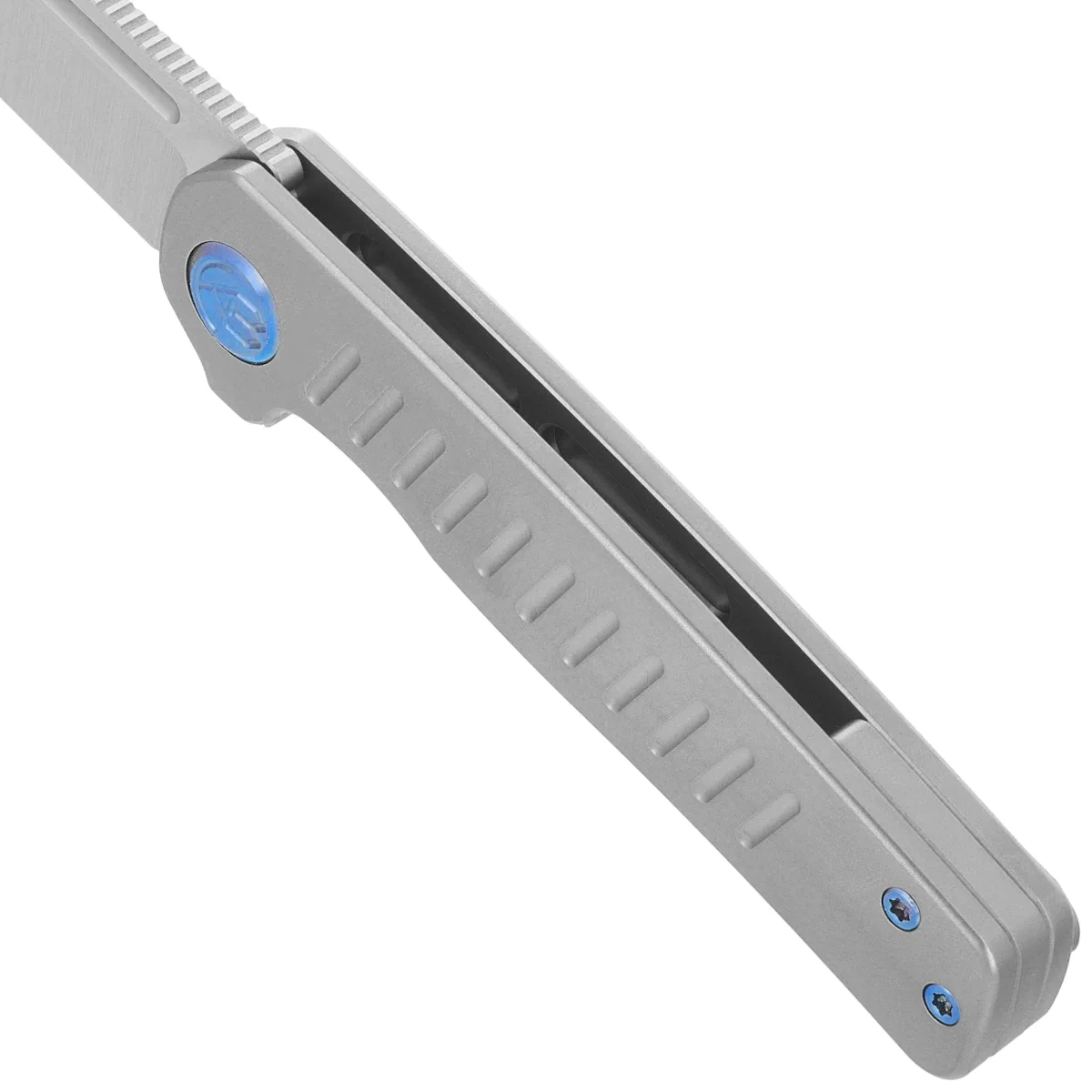 Rękojeść - z tytanu 6AL4V z charakterystycznymi poprzecznymi nacięciami, materiału niezwykle wytrzymałego mechanicznie i praktycznie całkowicie odpornego na warunki atmosferyczne i działanie chemikaliów. Całość skręcona do solidnego backspacera, również wykonanego z tytanu 6AL4V. Prosta, solidna konstrukcja daje pewność wieloletniego użytkowania. Podcięcie na palec (fore finger groove) poprawia pewność uchwytu. Jednopozycyjny (prawa) tytanowy klips deep carry pozwala przenosić dyskretnie nóż w kieszeni w pozycji tip-up (czubkiem ostrza do góry).