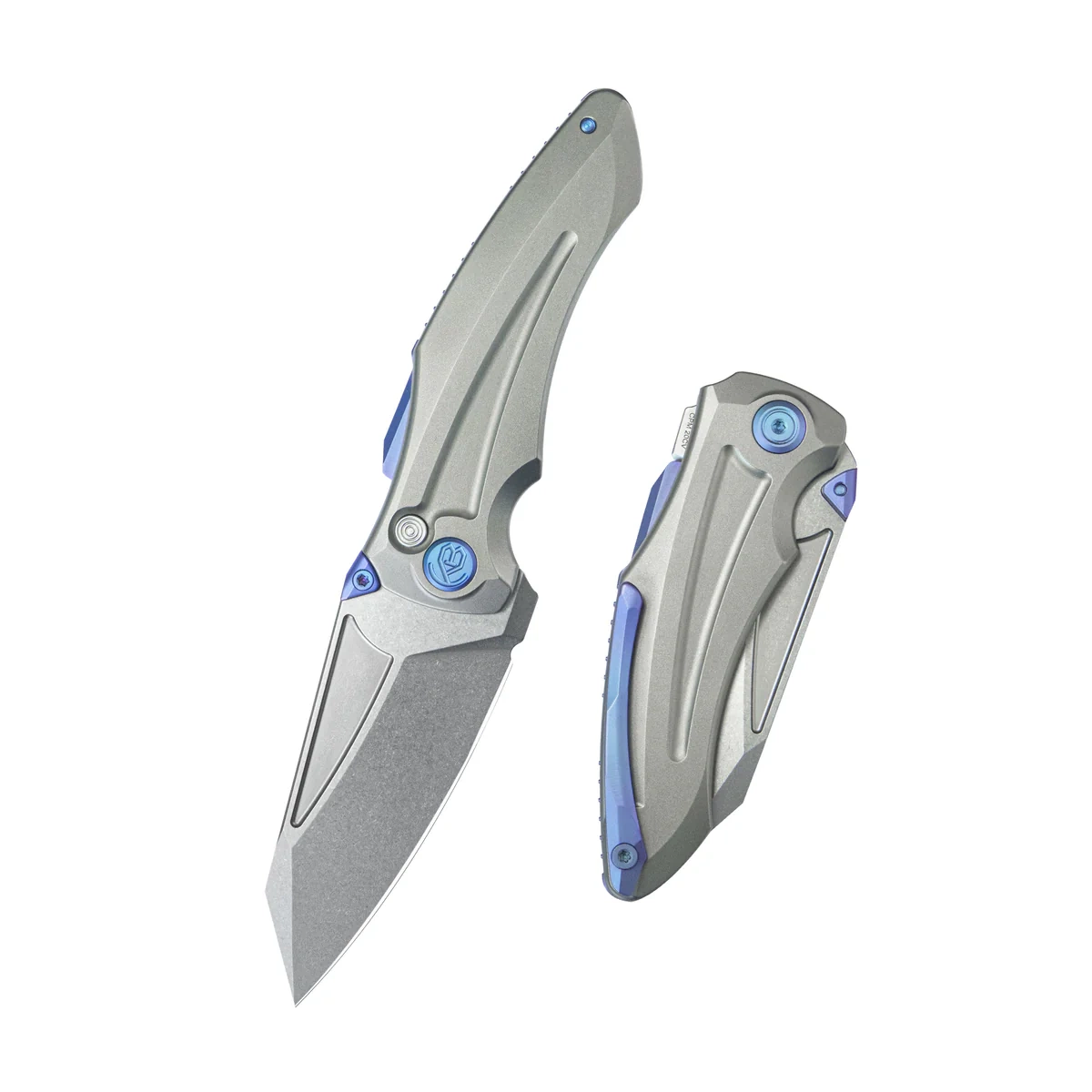 Rękojeść - okładziny z tytanu 6AL4V, materiału niezwykle wytrzymałego mechanicznie i praktycznie całkowicie odpornego na warunki atmosferyczne i działanie chemikaliów. Całość skręcona do solidnego backspacera, również wykonanego z tytanu 6AL4V. Prosta, solidna konstrukcja daje pewność wieloletniego użytkowania. Podcięcie na palec (fore finger groove) poprawia pewność uchwytu i tworzy mini-gardę zapobiegając ześlizgnięciu się dłoni na ostrze. Oś pivota zdobi stylizowane logo producenta. Jednopozycyjny (prawa) tytanowy klips deep carry pozwala przenosić dyskretnie nóż w kieszeni w pozycji tip-up (czubkiem ostrza do góry).