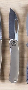 Rękojeść - profilowane okładziny z tytanu 6AL4V, mikrofrezowanego drobną teksturą. Całość skręcona do solidnego backspacera, również wykonanego z tytanu. Prosta, solidna konstrukcja daje pewność wieloletniego użytkowania. Oś pivota zdobi nakładka z tytanu (Pivot Cap) w kontrastowym kolorze. Dwupozycyjny (prawa/lewa) tytanowy klips deep carry pozwala przenosić dyskretnie nóż w kieszeni w pozycji tip-up (czubkiem ostrza do góry). Podcięcie na palec (fore finger groove) poprawia pewność uchwytu i tworzy mini-gardę zapobiegając ześlizgnięciu się dłoni na ostrze.