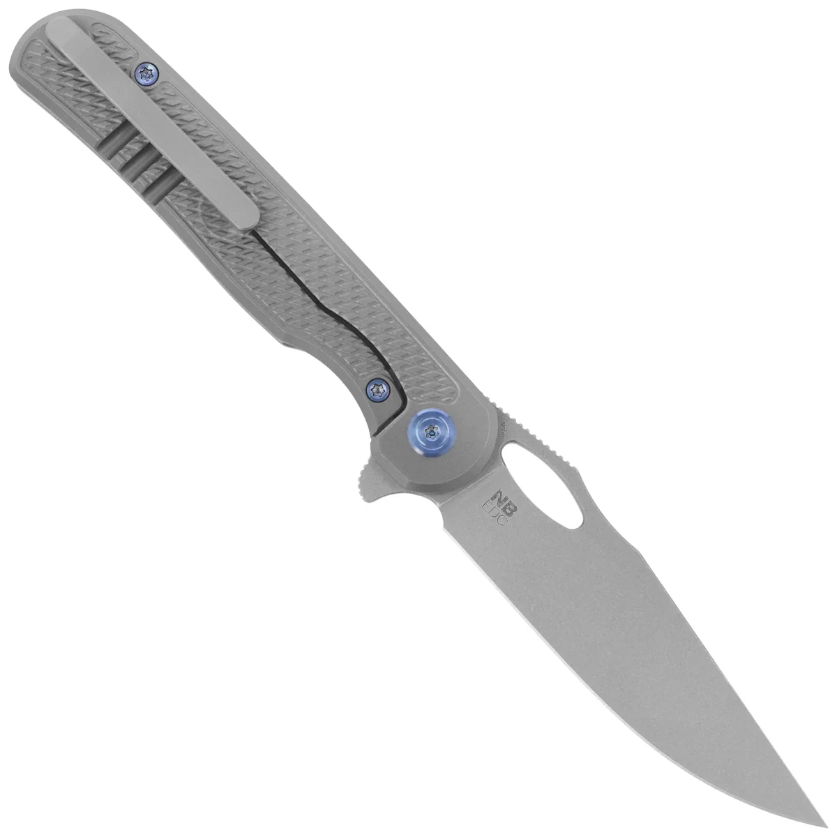 Rękojeść - z tytanu 6AL4V z charakterystycznym moletowaniem w diamenty, materiału niezwykle wytrzymałego mechanicznie i praktycznie całkowicie odpornego na warunki atmosferyczne i działanie chemikaliów. Całość skręcona do solidnego backspacera, również wykonanego z tytanu 6AL4V. Prosta, solidna konstrukcja daje pewność wieloletniego użytkowania. Podcięcie na palec (fore finger groove) poprawia pewność uchwytu. Jednopozycyjny (prawa) tytanowy klips deep carry pozwala przenosić dyskretnie nóż w kieszeni w pozycji tip-up (czubkiem ostrza do góry).