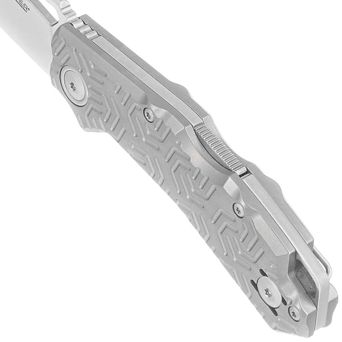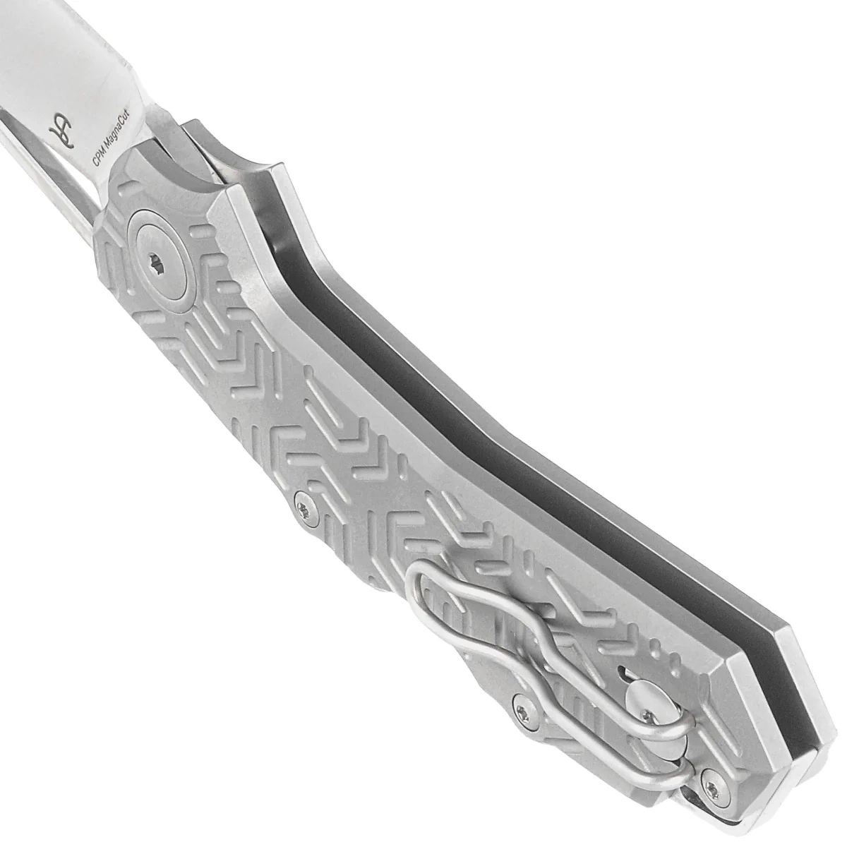 Rękojeść - okładziny z tytanu, metalu niezwykle wytrzymałego mechanicznie i praktycznie całkowicie odpornego na warunki atmosferyczne i działanie chemikaliów, pokryte geometryczną teksturą dla poprawienia chwytu. Masywny backspacer zapewnia pożądaną sztywność. Prosta, solidna konstrukcja daje pewność wieloletniego użytkowania. Klips dwupozycyjny (prawa/lewa), wykonany z drutu stalowego, umożliwia przenoszenie noża w pozycji tip-up. Oś pivota jest ozdobiona tytanową obręczą (pivot collar ring).